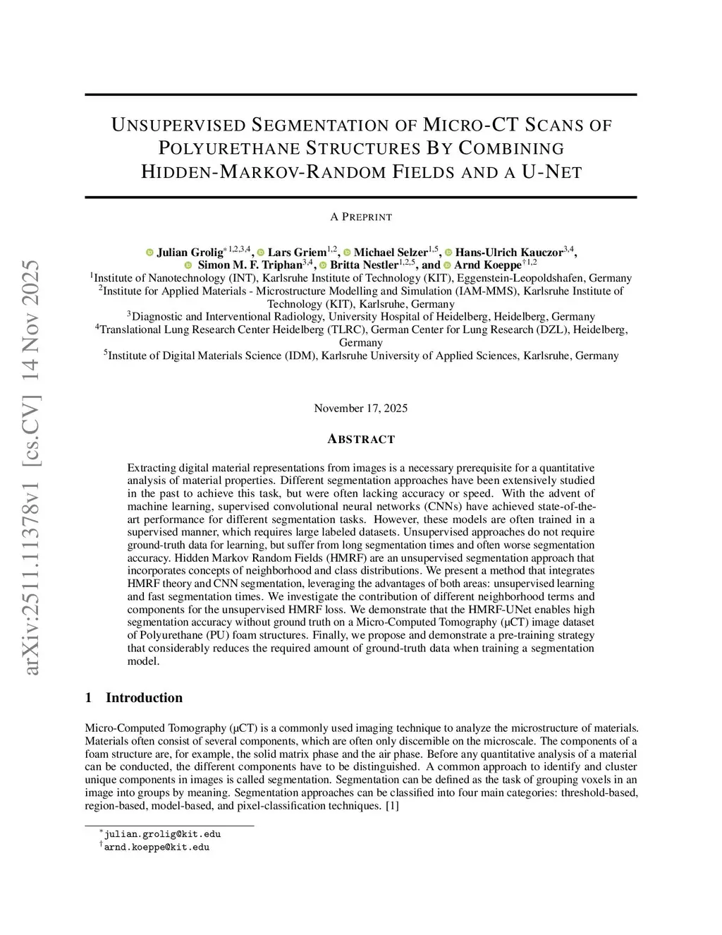Unsupervised Segmentation of Micro-CT Scans of Polyurethane Structures By Combining Hidden-Markov-Random Fields and a U-Net