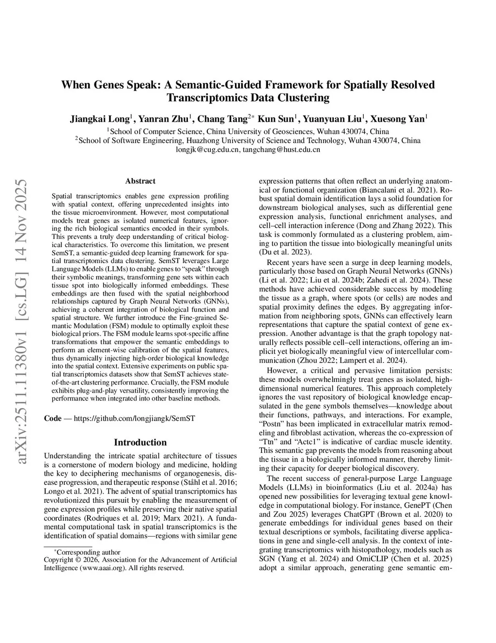 Spatial transcriptomics enables gene expression profiling with spatial context, offering unprecedented insights into the tissue microenvironment. However, most computational models treat genes as isolated numerical features, ignoring the rich biological semantics encoded in their symbols. This prevents a truly deep understanding of critical biological characteristics. To overcome this limitation, we present SemST, a semantic-guided deep learning framework for spatial transcriptomics data clustering. SemST leverages Large Language Models (LLMs) to enable genes to "speak" through their symbolic meanings, transforming gene sets within each tissue spot into biologically informed embeddings. These embeddings are then fused with the spatial neighborhood relationships captured by Graph Neural Networks (GNNs), achieving a coherent integration of biological function and spatial structure. We further introduce the Fine-grained Semantic Modulation (FSM) module to optimally exploit these biological priors. The FSM module learns spot-specific affine transformations that empower the semantic embeddings to perform an element-wise calibration of the spatial features, thus dynamically injecting high-order biological knowledge into the spatial context. Extensive experiments on public spatial transcriptomics datasets show that SemST achieves state-of-the-art clustering performance. Crucially, the FSM module exhibits plug-and-play versatility, consistently improving the performance when integrated into other baseline methods.