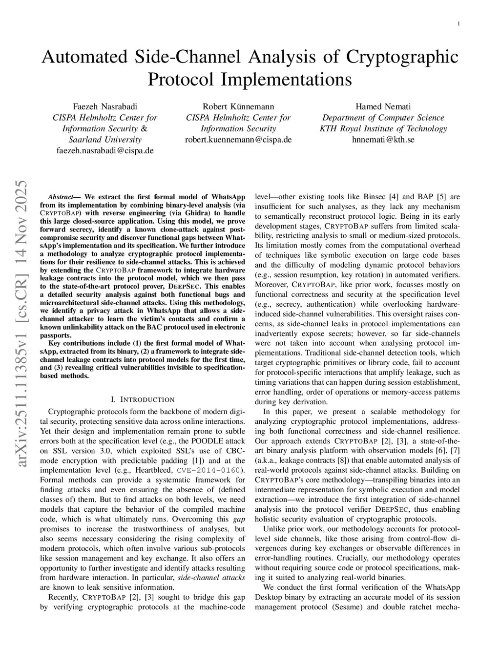 We extract the first formal model of WhatsApp from its implementation by combining binary-level analysis (via CryptoBap) with reverse engineering (via Ghidra) to handle this large closed-source application. Using this model, we prove forward secrecy, identify a known clone-attack against post-compromise security and discover functional gaps between WhatsApp's implementation and its specification. We further introduce a methodology to analyze cryptographic protocol implementations for their resilience to side-channel attacks. This is achieved by extending the CryptoBap framework to integrate hardware leakage contracts into the protocol model, which we then pass to the state-of-the-art protocol prover, DeepSec. This enables a detailed security analysis against both functional bugs and microarchitectural side-channel attacks. Using this methodology, we identify a privacy attack in WhatsApp that allows a side-channel attacker to learn the victim's contacts and confirm a known unlinkability attack on the BAC protocol used in electronic passports.Key contributions include (1) the first formal model of WhatsApp, extracted from its binary, (2) a framework to integrate side-channel leakage contracts into protocol models for the first time, and (3) revealing critical vulnerabilities invisible to specification-based methods.