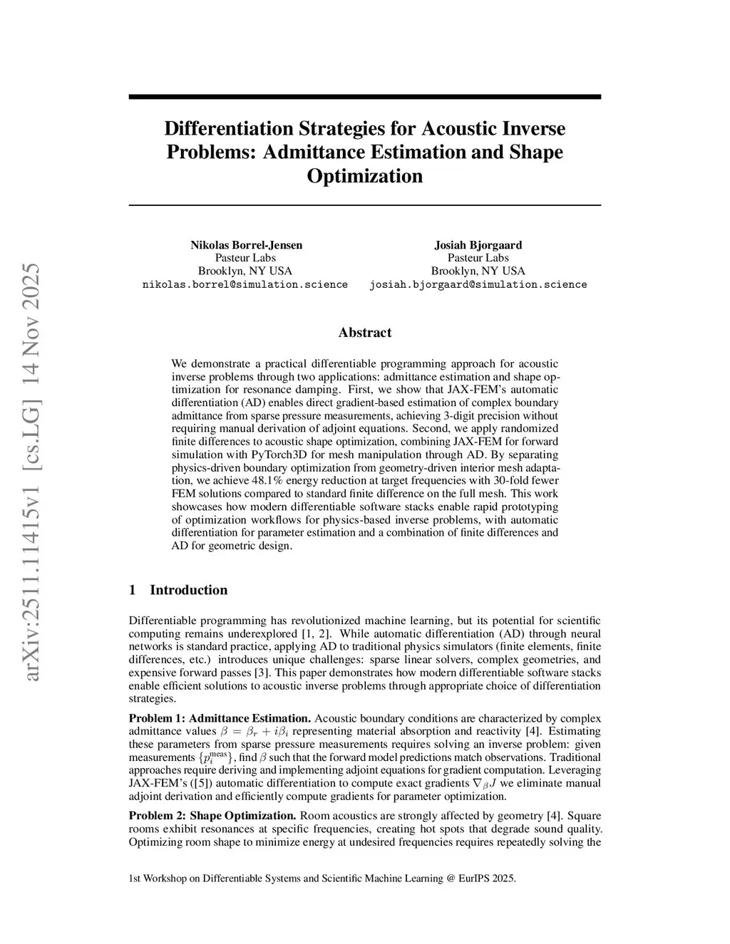 We demonstrate a practical differentiable programming approach for acoustic inverse problems through two applications: admittance estimation and shape optimization for resonance damping. First, we show that JAX-FEM's automatic differentiation (AD) enables direct gradient-based estimation of complex boundary admittance from sparse pressure measurements, achieving 3-digit precision without requiring manual derivation of adjoint equations. Second, we apply randomized finite differences to acoustic shape optimization, combining JAX-FEM for forward simulation with PyTorch3D for mesh manipulation through AD. By separating physics-driven boundary optimization from geometry-driven interior mesh adaptation, we achieve 48.1% energy reduction at target frequencies with 30-fold fewer FEM solutions compared to standard finite difference on the full mesh. This work showcases how modern differentiable software stacks enable rapid prototyping of optimization workflows for physics-based inverse problems, with automatic differentiation for parameter estimation and a combination of finite differences and AD for geometric design.