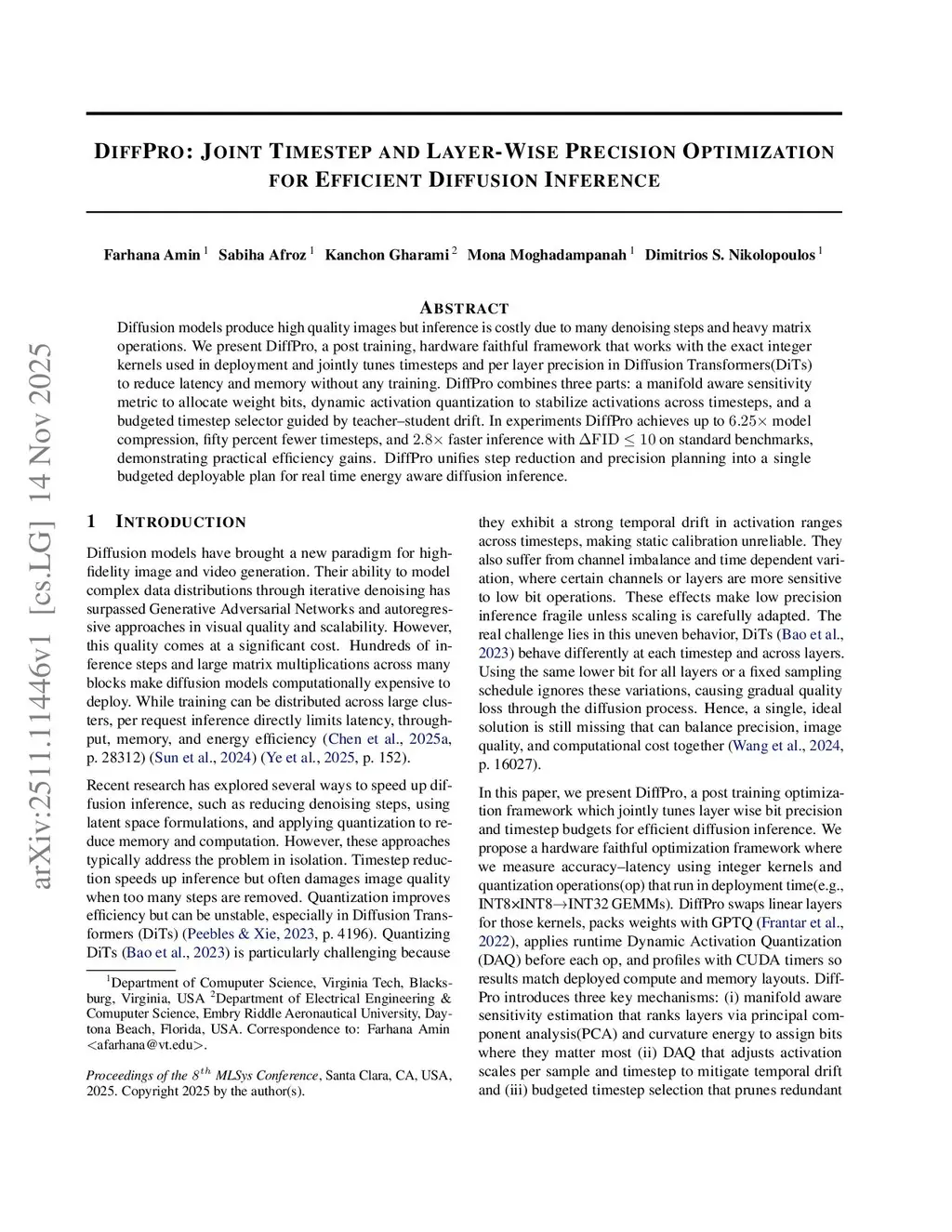 Diffusion models produce high quality images but inference is costly due to many denoising steps and heavy matrix operations. We present DiffPro, a post-training, hardware-faithful framework that works with the exact integer kernels used in deployment and jointly tunes timesteps and per-layer precision in Diffusion Transformers (DiTs) to reduce latency and memory without any training. DiffPro combines three parts: a manifold-aware sensitivity metric to allocate weight bits, dynamic activation quantization to stabilize activations across timesteps, and a budgeted timestep selector guided by teacher-student drift. In experiments DiffPro achieves up to 6.25x model compression, fifty percent fewer timesteps, and 2.8x faster inference with Delta FID <= 10 on standard benchmarks, demonstrating practical efficiency gains. DiffPro unifies step reduction and precision planning into a single budgeted deployable plan for real-time energy-aware diffusion inference.