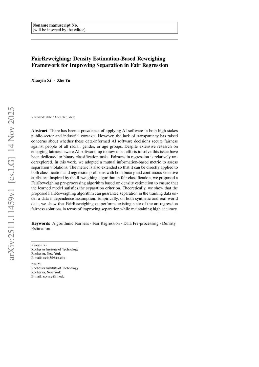 There has been a prevalence of applying AI software in both high-stakes public-sector and industrial contexts. However, the lack of transparency has raised concerns about whether these data-informed AI software decisions secure fairness against people of all racial, gender, or age groups. Despite extensive research on emerging fairness-aware AI software, up to now most efforts to solve this issue have been dedicated to binary classification tasks. Fairness in regression is relatively underexplored. In this work, we adopted a mutual information-based metric to assess separation violations. The metric is also extended so that it can be directly applied to both classification and regression problems with both binary and continuous sensitive attributes. Inspired by the Reweighing algorithm in fair classification, we proposed a FairReweighing pre-processing algorithm based on density estimation to ensure that the learned model satisfies the separation criterion. Theoretically, we show that the proposed FairReweighing algorithm can guarantee separation in the training data under a data independence assumption. Empirically, on both synthetic and real-world data, we show that FairReweighing outperforms existing state-of-the-art regression fairness solutions in terms of improving separation while maintaining high accuracy.