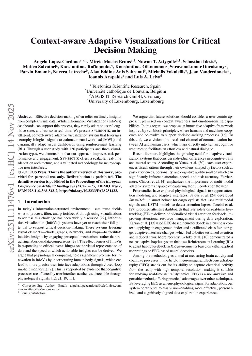 Effective decision-making often relies on timely insights from complex visual data. While Information Visualization (InfoVis) dashboards can support this process, they rarely adapt to users' cognitive state, and less so in real time. We present Symbiotik, an intelligent, context-aware adaptive visualization system that leverages neurophysiological signals to estimate mental workload (MWL) and dynamically adapt visual dashboards using reinforcement learning (RL). Through a user study with 120 participants and three visualization types, we demonstrate that our approach improves task performance and engagement. Symbiotik offers a scalable, real-time adaptation architecture, and a validated methodology for neuroadaptive user interfaces.