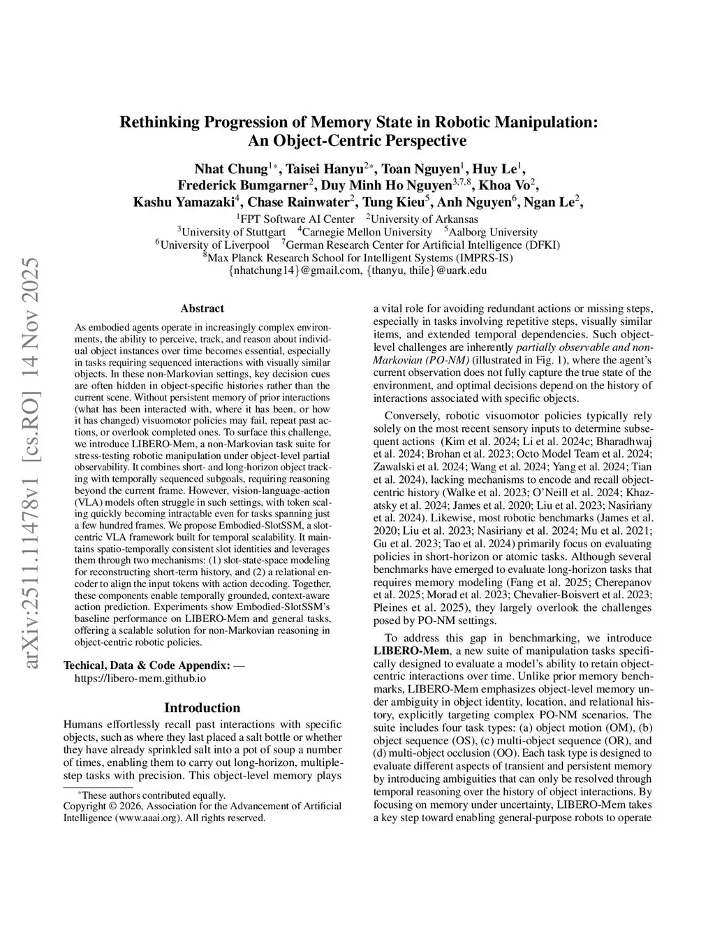 As embodied agents operate in increasingly complex environments, the ability to perceive, track, and reason about individual object instances over time becomes essential, especially in tasks requiring sequenced interactions with visually similar objects. In these non-Markovian settings, key decision cues are often hidden in object-specific histories rather than the current scene. Without persistent memory of prior interactions (what has been interacted with, where it has been, or how it has changed) visuomotor policies may fail, repeat past actions, or overlook completed ones. To surface this challenge, we introduce LIBERO-Mem, a non-Markovian task suite for stress-testing robotic manipulation under object-level partial observability. It combines short- and long-horizon object tracking with temporally sequenced subgoals, requiring reasoning beyond the current frame. However, vision-language-action (VLA) models often struggle in such settings, with token scaling quickly becoming intractable even for tasks spanning just a few hundred frames. We propose Embodied-SlotSSM, a slot-centric VLA framework built for temporal scalability. It maintains spatio-temporally consistent slot identities and leverages them through two mechanisms: (1) slot-state-space modeling for reconstructing short-term history, and (2) a relational encoder to align the input tokens with action decoding. Together, these components enable temporally grounded, context-aware action prediction. Experiments show Embodied-SlotSSM's baseline performance on LIBERO-Mem and general tasks, offering a scalable solution for non-Markovian reasoning in object-centric robotic policies.