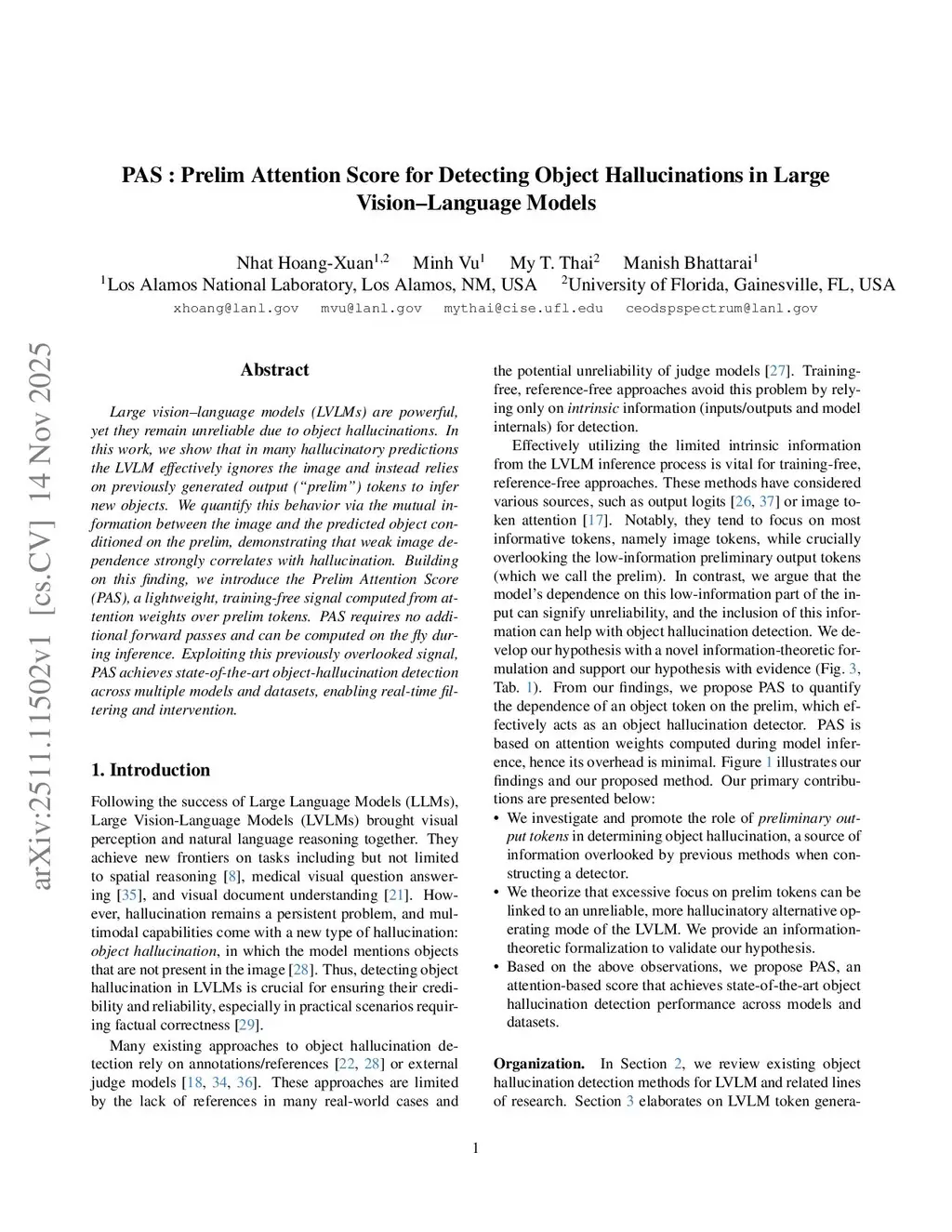 PAS : Prelim Attention Score for Detecting Object Hallucinations in Large Vision--Language Models