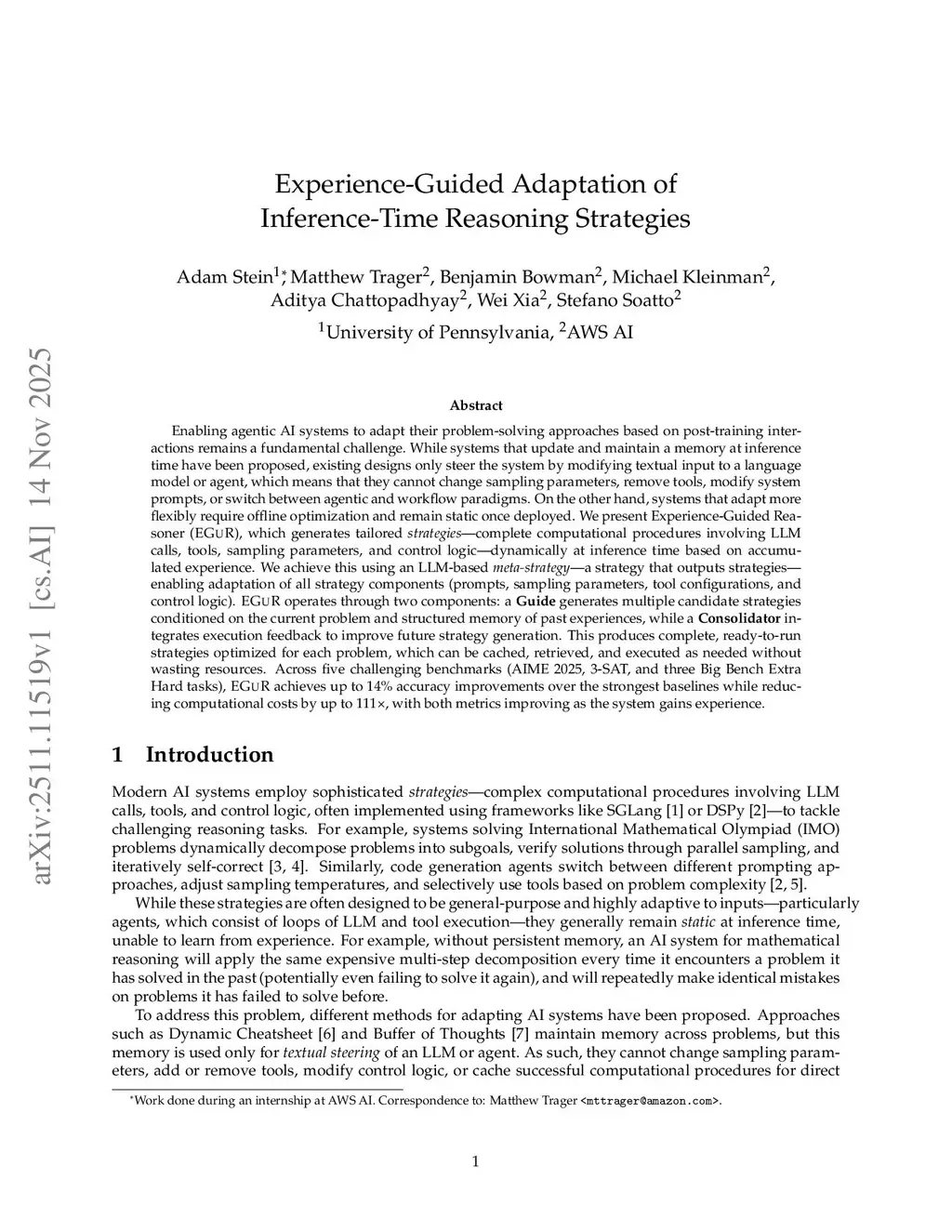 Enabling agentic AI systems to adapt their problem-solving approaches based on post-training interactions remains a fundamental challenge. While systems that update and maintain a memory at inference time have been proposed, existing designs only steer the system by modifying textual input to a language model or agent, which means that they cannot change sampling parameters, remove tools, modify system prompts, or switch between agentic and workflow paradigms. On the other hand, systems that adapt more flexibly require offline optimization and remain static once deployed. We present Experience-Guided Reasoner (EGuR), which generates tailored strategies -- complete computational procedures involving LLM calls, tools, sampling parameters, and control logic -- dynamically at inference time based on accumulated experience. We achieve this using an LLM-based meta-strategy -- a strategy that outputs strategies -- enabling adaptation of all strategy components (prompts, sampling parameters, tool configurations, and control logic). EGuR operates through two components: a Guide generates multiple candidate strategies conditioned on the current problem and structured memory of past experiences, while a Consolidator integrates execution feedback to improve future strategy generation. This produces complete, ready-to-run strategies optimized for each problem, which can be cached, retrieved, and executed as needed without wasting resources. Across five challenging benchmarks (AIME 2025, 3-SAT, and three Big Bench Extra Hard tasks), EGuR achieves up to 14% accuracy improvements over the strongest baselines while reducing computational costs by up to 111x, with both metrics improving as the system gains experience.