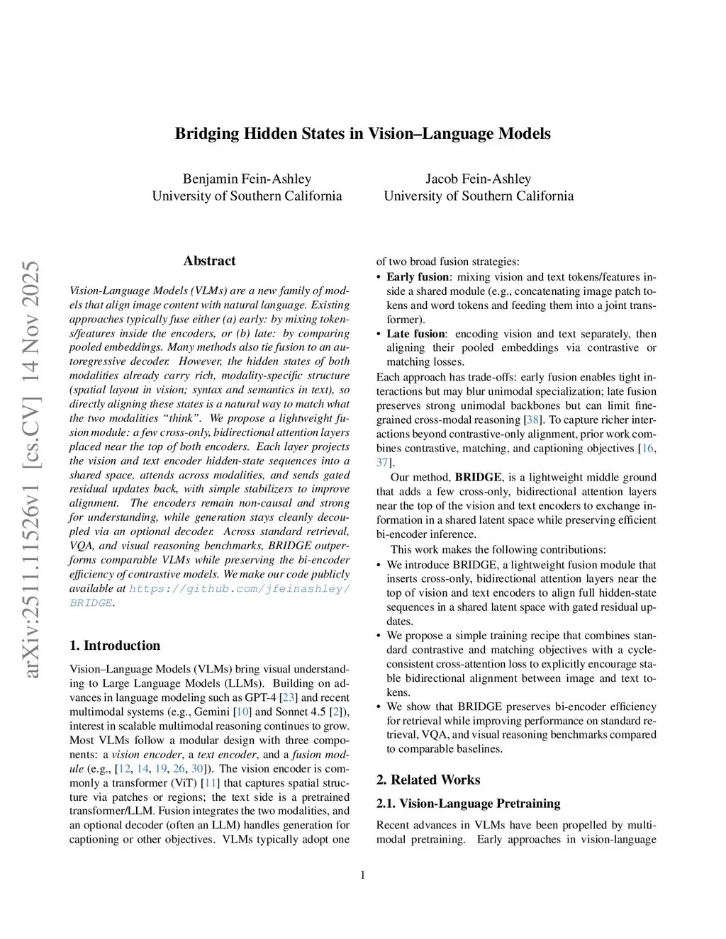Vision-Language Models (VLMs) are a new family of models that align image content with natural language. Existing approaches typically fuse either (a) early: by mixing tokens/features inside the encoders, or (b) late: by comparing pooled embeddings. Many methods also tie fusion to an autoregressive decoder. However, the hidden states of both modalities already carry rich, modality-specific structure (spatial layout in vision; syntax and semantics in text), so directly aligning these states is a natural way to match what the two modalities "think". We propose a lightweight fusion module: a few cross-only, bidirectional attention layers placed near the top of both encoders. Each layer projects the vision and text encoder hidden-state sequences into a shared space, attends across modalities, and sends gated residual updates back, with simple stabilizers to improve alignment. The encoders remain non-causal and strong for understanding, while generation stays cleanly decoupled via an optional decoder. Across standard retrieval, VQA, and visual reasoning benchmarks, BRIDGE outperforms comparable VLMs while preserving the bi-encoder efficiency of contrastive models. We make our code publicly available atthis https URL.