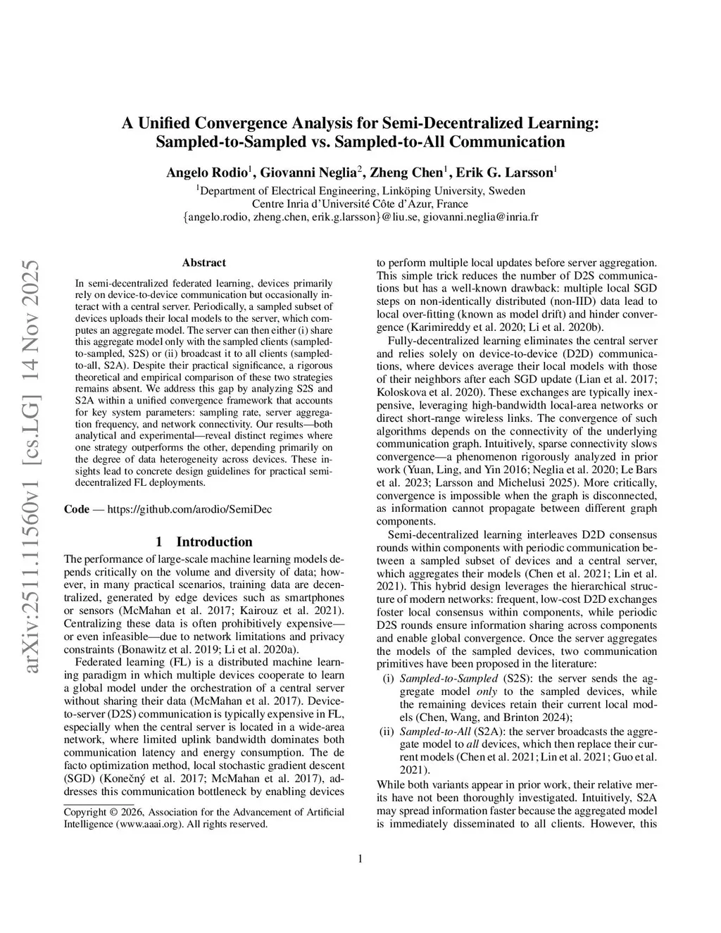 A Unified Convergence Analysis for Semi-Decentralized Learning: Sampled-to-Sampled vs. Sampled-to-All Communication