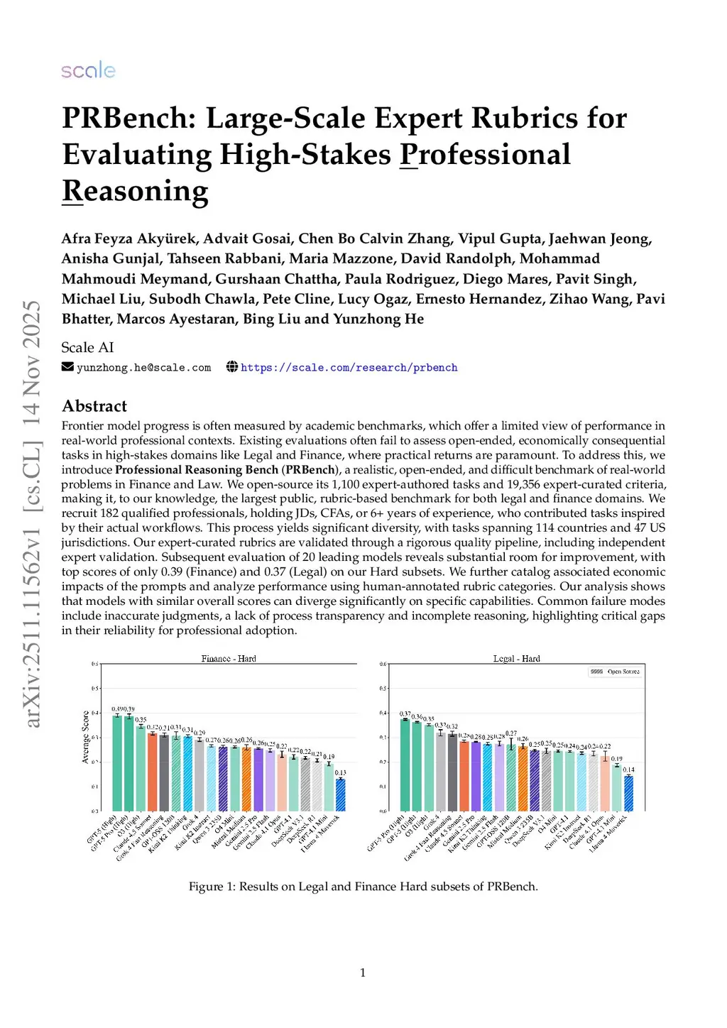 Frontier model progress is often measured by academic benchmarks, which offer a limited view of performance in real-world professional contexts. Existing evaluations often fail to assess open-ended, economically consequential tasks in high-stakes domains like Legal and Finance, where practical returns are paramount. To address this, we introduce Professional Reasoning Bench (PRBench), a realistic, open-ended, and difficult benchmark of real-world problems in Finance and Law. We open-source its 1,100 expert-authored tasks and 19,356 expert-curated criteria, making it, to our knowledge, the largest public, rubric-based benchmark for both legal and finance domains. We recruit 182 qualified professionals, holding JDs, CFAs, or 6+ years of experience, who contributed tasks inspired by their actual workflows. This process yields significant diversity, with tasks spanning 114 countries and 47 US jurisdictions. Our expert-curated rubrics are validated through a rigorous quality pipeline, including independent expert validation. Subsequent evaluation of 20 leading models reveals substantial room for improvement, with top scores of only 0.39 (Finance) and 0.37 (Legal) on our Hard subsets. We further catalog associated economic impacts of the prompts and analyze performance using human-annotated rubric categories. Our analysis shows that models with similar overall scores can diverge significantly on specific capabilities. Common failure modes include inaccurate judgments, a lack of process transparency and incomplete reasoning, highlighting critical gaps in their reliability for professional adoption.