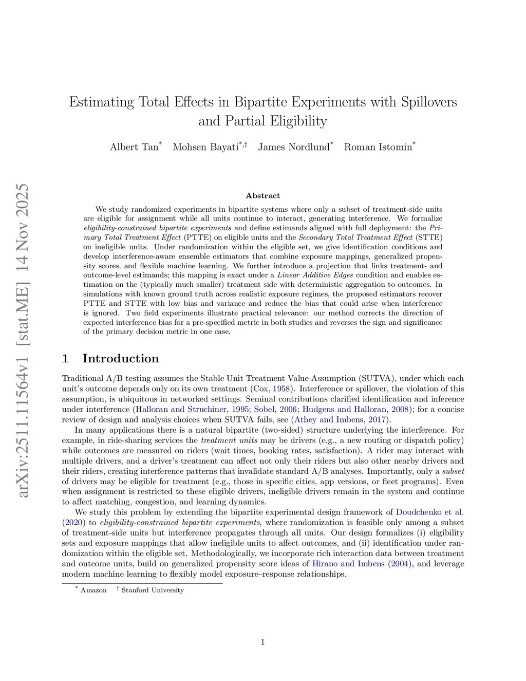 We study randomized experiments in bipartite systems where only a subset of treatment-side units are eligible for assignment while all units continue to interact, generating interference. We formalize eligibility-constrained bipartite experiments and define estimands aligned with full deployment: the Primary Total Treatment Effect (PTTE) on eligible units and the Secondary Total Treatment Effect (STTE) on ineligible units. Under randomization within the eligible set, we give identification conditions and develop interference-aware ensemble estimators that combine exposure mappings, generalized propensity scores, and flexible machine learning. We further introduce a projection that links treatment- and outcome-level estimands; this mapping is exact under a Linear Additive Edges condition and enables estimation on the (typically much smaller) treatment side with deterministic aggregation to outcomes. In simulations with known ground truth across realistic exposure regimes, the proposed estimators recover PTTE and STTE with low bias and variance and reduce the bias that could arise when interference is ignored. Two field experiments illustrate practical relevance: our method corrects the direction of expected interference bias for a pre-specified metric in both studies and reverses the sign and significance of the primary decision metric in one case.