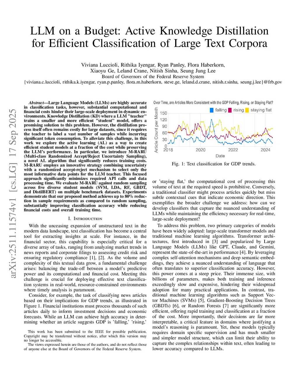Large Language Models (LLMs) are highly accurate in classification tasks, however, substantial computational and financial costs hinder their large-scale deployment in dynamic environments. Knowledge Distillation (KD) where a LLM "teacher" trains a smaller and more efficient "student" model, offers a promising solution to this problem. However, the distillation process itself often remains costly for large datasets, since it requires the teacher to label a vast number of samples while incurring significant token consumption. To alleviate this challenge, in this work we explore the active learning (AL) as a way to create efficient student models at a fraction of the cost while preserving the LLM's performance. In particular, we introduce M-RARU (Multi-class Randomized Accept/Reject Uncertainty Sampling), a novel AL algorithm that significantly reduces training costs. M-RARU employs an innovative strategy combining uncertainty with a randomized accept-reject mechanism to select only the most informative data points for the LLM teacher. This focused approach significantly minimizes required API calls and data processing time. We evaluate M-RARU against random sampling across five diverse student models (SVM, LDA, RF, GBDT, and DistilBERT) on multiple benchmark datasets. Experiments demonstrate that our proposed method achieves up to 80% reduction in sample requirements as compared to random sampling, substantially improving classification accuracy while reducing financial costs and overall training time.