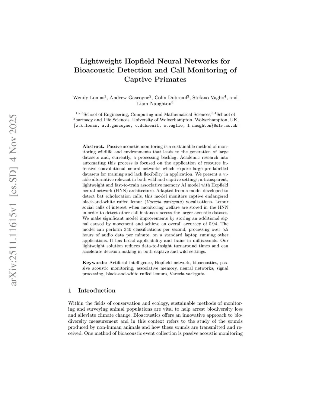 Passive acoustic monitoring is a sustainable method of monitoring wildlife and environments that leads to the generation of large datasets and, currently, a processing backlog. Academic research into automating this process is focused on the application of resource intensive convolutional neural networks which require large pre-labelled datasets for training and lack flexibility in application. We present a viable alternative relevant in both wild and captive settings; a transparent, lightweight and fast-to-train associative memory AI model with Hopfield neural network (HNN) architecture. Adapted from a model developed to detect bat echolocation calls, this model monitors captive endangered black-and-white ruffed lemur Varecia variegata vocalisations. Lemur social calls of interest when monitoring welfare are stored in the HNN in order to detect other call instances across the larger acoustic dataset. We make significant model improvements by storing an additional signal caused by movement and achieve an overall accuracy of 0.94. The model can perform classifications per second, processing over 5.5 hours of audio data per minute, on a standard laptop running other applications. It has broad applicability and trains in milliseconds. Our lightweight solution reduces data-to-insight turnaround times and can accelerate decision making in both captive and wild settings.