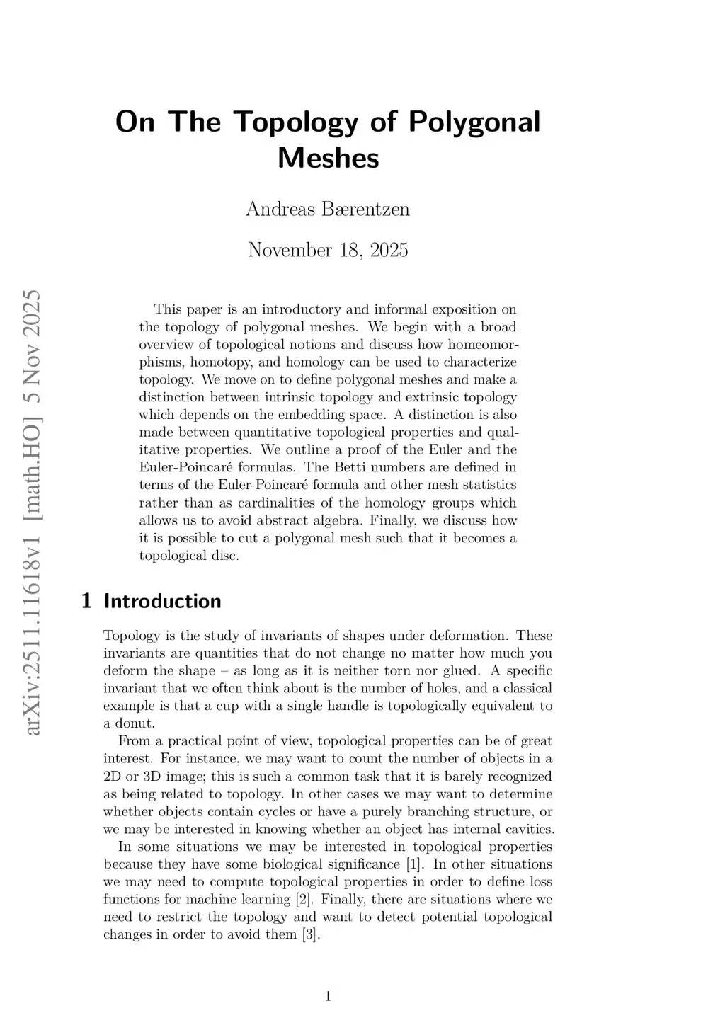 This paper is an introductory and informal exposition on the topology of polygonal meshes. We begin with a broad overview of topological notions and discuss how homeomorphisms, homotopy, and homology can be used to characterise topology. We move on to define polygonal meshes and make a distinction between intrinsic topology and extrinsic topology which depends on the space in which the mesh is immersed. A distinction is also made between quantitative topological properties and qualitative properties. Next, we outline proofs of the Euler and the Euler-Poincaré formulas. The Betti numbers are then defined in terms of the Euler-Poincaré formula and other mesh statistics rather than as cardinalities of the homology groups which allows us to avoid abstract algebra. Finally, we discuss how it is possible to cut a polygonal mesh such that it becomes a topological disc.