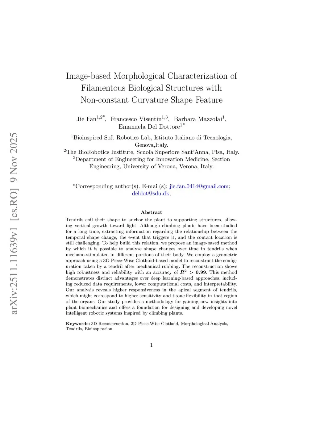 Tendrils coil their shape to anchor the plant to supporting structures, allowing vertical growth toward light. Although climbing plants have been studied for a long time, extracting information regarding the relationship between the temporal shape change, the event that triggers it, and the contact location is still challenging. To help build this relation, we propose an image-based method by which it is possible to analyze shape changes over time in tendrils when mechano-stimulated in different portions of their body. We employ a geometric approach using a 3D Piece-Wise Clothoid-based model to reconstruct the configuration taken by a tendril after mechanical rubbing. The reconstruction shows high robustness and reliability with an accuracy of R2 > 0.99. This method demonstrates distinct advantages over deep learning-based approaches, including reduced data requirements, lower computational costs, and interpretability. Our analysis reveals higher responsiveness in the apical segment of tendrils, which might correspond to higher sensitivity and tissue flexibility in that region of the organs. Our study provides a methodology for gaining new insights into plant biomechanics and offers a foundation for designing and developing novel intelligent robotic systems inspired by climbing plants.