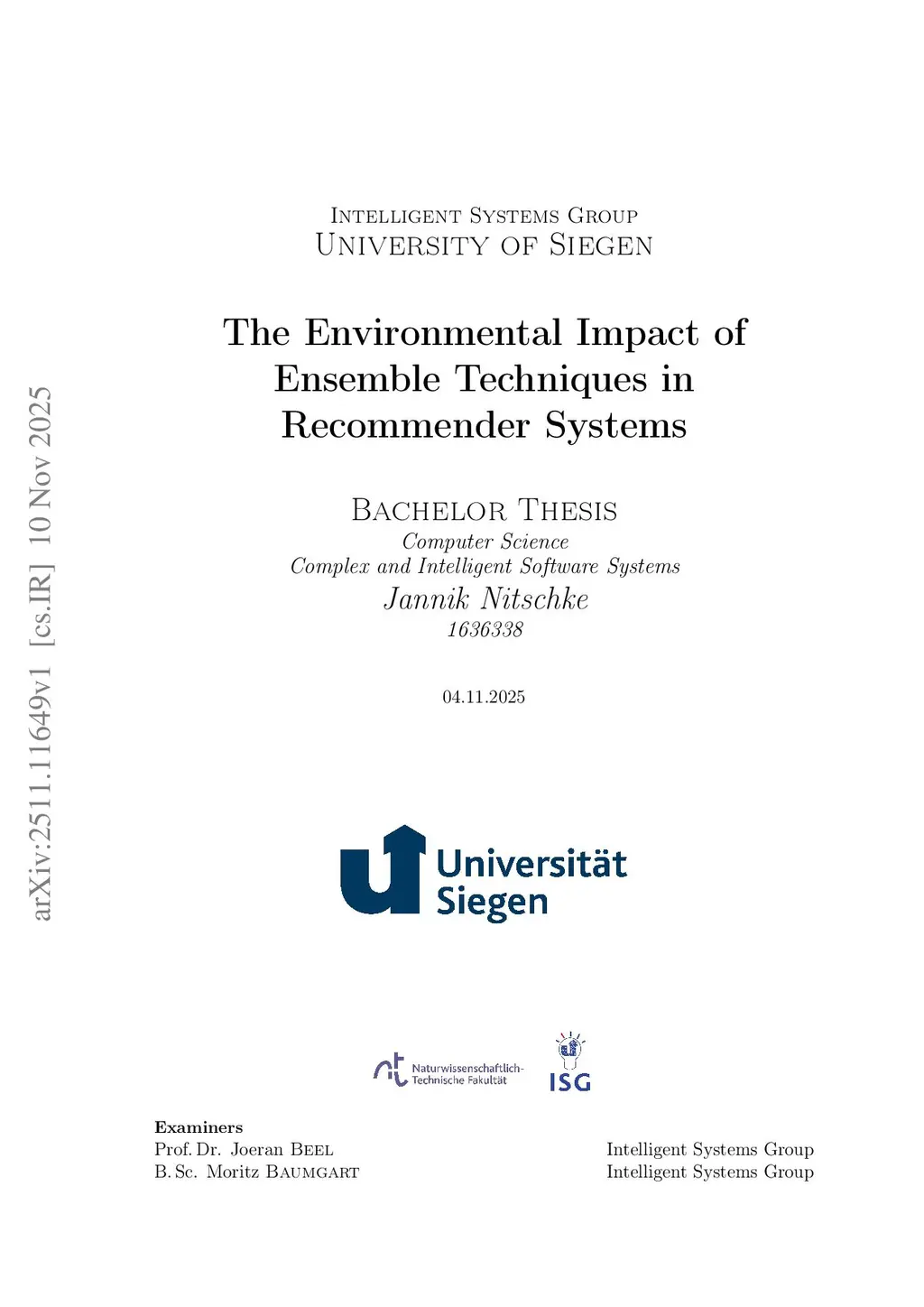 Ensemble techniques in recommender systems have demonstrated accuracy improvements of 10-30%, yet their environmental impact remains unmeasured. While deep learning recommendation algorithms can generate up to 3,297 kg CO2 per paper, ensemble methods have not been sufficiently evaluated for energy consumption. This thesis investigates how ensemble techniques influence environmental impact compared to single optimized models.We conducted 93 experiments across two frameworks (Surprise for rating prediction, LensKit for ranking) on four datasets spanning 100,000 to 7.8 million interactions. We evaluated four ensemble strategies (Average, Weighted, Stacking/Rank Fusion, Top Performers) against simple baselines and optimized single models, measuring energy consumption with a smart plug.Results revealed a non-linear accuracy-energy relationship. Ensemble methods achieved 0.3-5.7% accuracy improvements while consuming 19-2,549% more energy depending on dataset size and strategy. The Top Performers ensemble showed best efficiency: 0.96% RMSE improvement with 18.8% energy overhead on MovieLens-1M, and 5.7% NDCG improvement with 103% overhead on MovieLens-100K. Exhaustive averaging strategies consumed 88-270% more energy for comparable gains. On the largest dataset (Anime, 7.8M interactions), the Surprise ensemble consumed 2,005% more energy (0.21 Wh vs. 0.01 Wh) for 1.2% accuracy improvement, producing 53.8 mg CO2 versus 2.6 mg CO2 for the single model.This research provides one of the first systematic measurements of energy and carbon footprint for ensemble recommender systems, demonstrates that selective strategies offer superior efficiency over exhaustive averaging, and identifies scalability limitations at industrial scale. These findings enable informed decisions about sustainable algorithm selection in recommender systems.