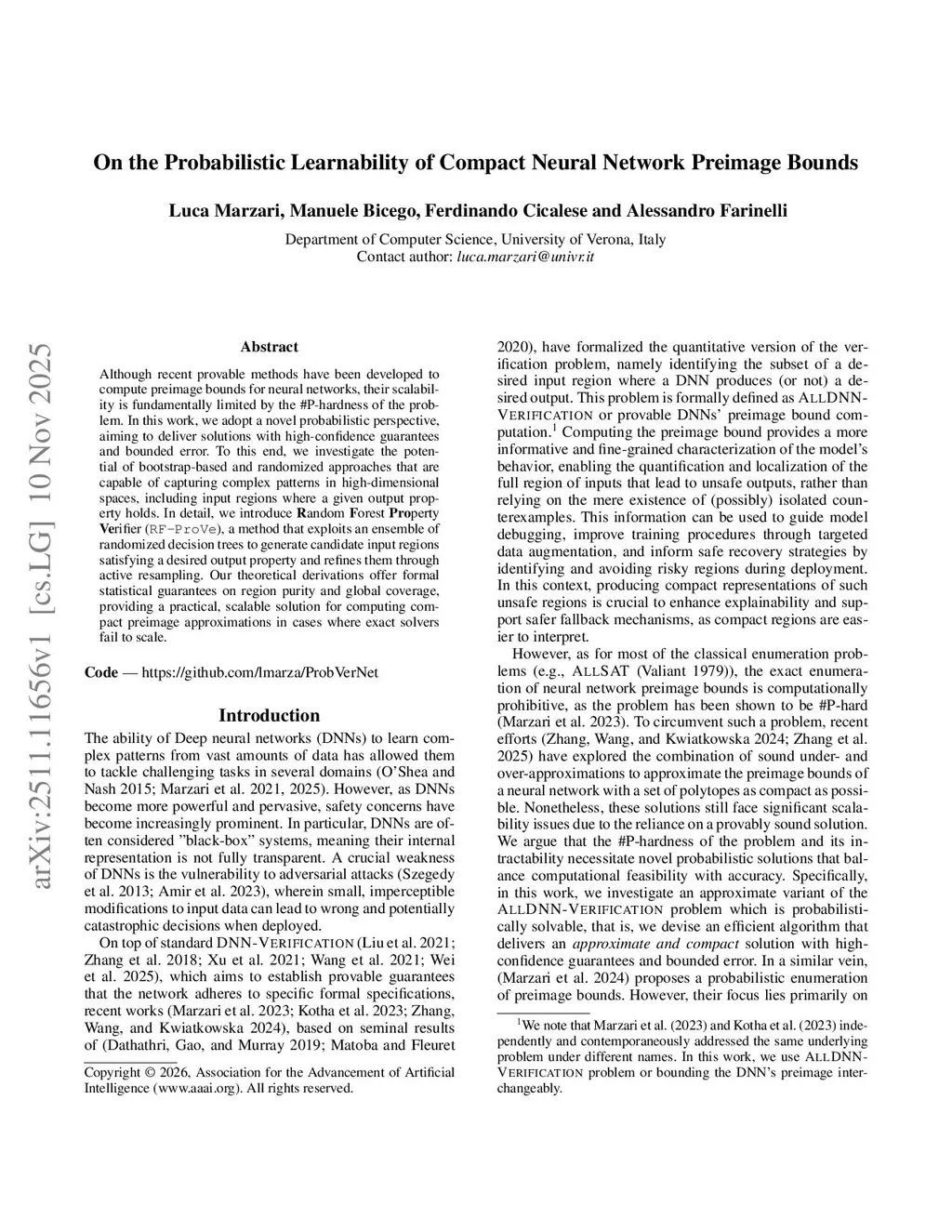Although recent provable methods have been developed to compute preimage bounds for neural networks, their scalability is fundamentally limited by the #P-hardness of the problem. In this work, we adopt a novel probabilistic perspective, aiming to deliver solutions with high-confidence guarantees and bounded error. To this end, we investigate the potential of bootstrap-based and randomized approaches that are capable of capturing complex patterns in high-dimensional spaces, including input regions where a given output property holds. In detail, we introduce andom orest perty rifier (), a method that exploits an ensemble of randomized decision trees to generate candidate input regions satisfying a desired output property and refines them through active resampling. Our theoretical derivations offer formal statistical guarantees on region purity and global coverage, providing a practical, scalable solution for computing compact preimage approximations in cases where exact solvers fail to scale.