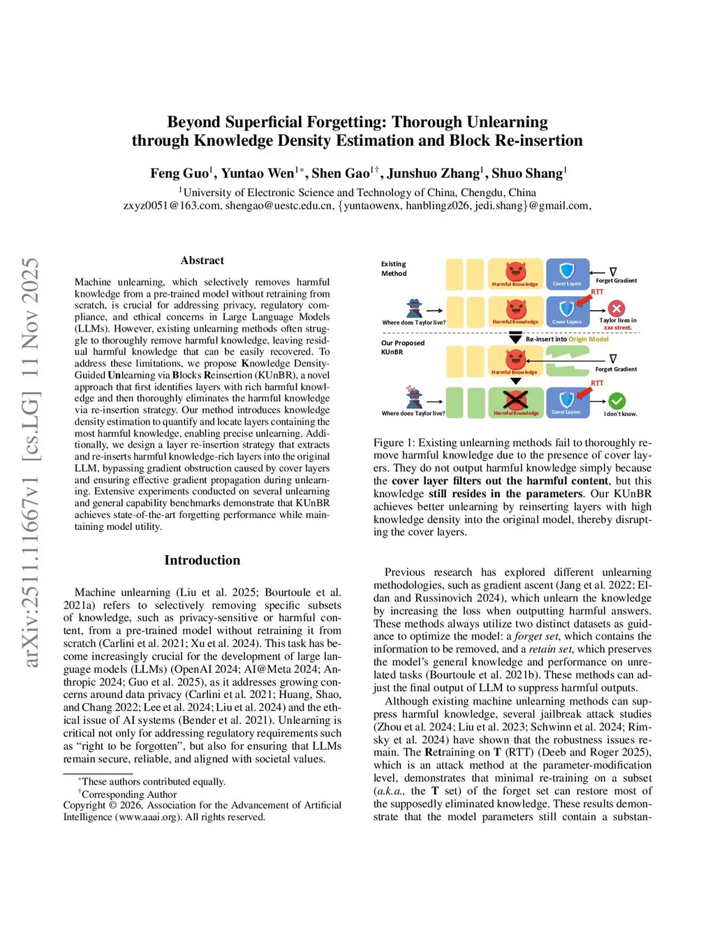 Beyond Superficial Forgetting: Thorough Unlearning through Knowledge Density Estimation and Block Re-insertion