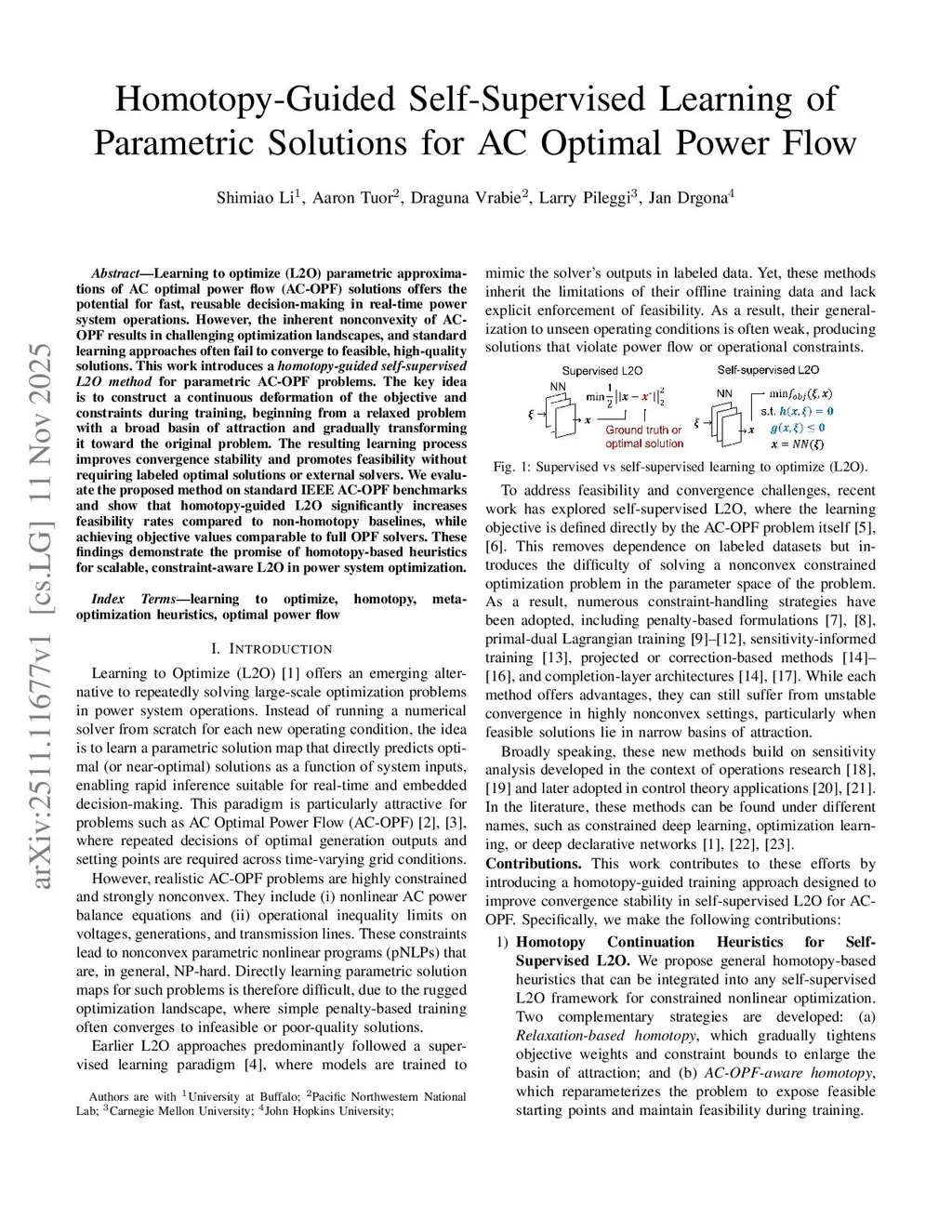 Learning to optimize (L2O) parametric approximations of AC optimal power flow (AC-OPF) solutions offers the potential for fast, reusable decision-making in real-time power system operations. However, the inherent nonconvexity of AC-OPF results in challenging optimization landscapes, and standard learning approaches often fail to converge to feasible, high-quality solutions. This work introduces a \textit{homotopy-guided self-supervised L2O method} for parametric AC-OPF problems. The key idea is to construct a continuous deformation of the objective and constraints during training, beginning from a relaxed problem with a broad basin of attraction and gradually transforming it toward the original problem. The resulting learning process improves convergence stability and promotes feasibility without requiring labeled optimal solutions or external solvers. We evaluate the proposed method on standard IEEE AC-OPF benchmarks and show that homotopy-guided L2O significantly increases feasibility rates compared to non-homotopy baselines, while achieving objective values comparable to full OPF solvers. These findings demonstrate the promise of homotopy-based heuristics for scalable, constraint-aware L2O in power system optimization.