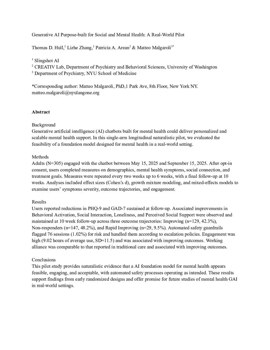 Generative artificial intelligence (GAI) chatbots built for mental health could deliver safe, personalized, and scalable mental health support. We evaluate a foundation model designed for mental health. Adults completed mental health measures while engaging with the chatbot between May 15, 2025 and September 15, 2025. Users completed an opt-in consent, demographic information, mental health symptoms, social connection, and self-identified goals. Measures were repeated every two weeks up to 6 weeks, and a final follow-up at 10 weeks. Analyses included effect sizes, and growth mixture models to identify participant groups and their characteristic engagement, severity, and demographic factors. Users demonstrated significant reductions in PHQ-9 and GAD-7 that were sustained at follow-up. Significant improvements in Hope, Behavioral Activation, Social Interaction, Loneliness, and Perceived Social Support were observed throughout and maintained at 10 week follow-up. Engagement was high and predicted outcomes. Working alliance was comparable to traditional care and predicted outcomes. Automated safety guardrails functioned as designed, with 76 sessions flagged for risk and all handled according to escalation policies. This single arm naturalistic observational study provides initial evidence that a GAI foundation model for mental health can deliver accessible, engaging, effective, and safe mental health support. These results lend support to findings from early randomized designs and offer promise for future study of mental health GAI in real world settings.