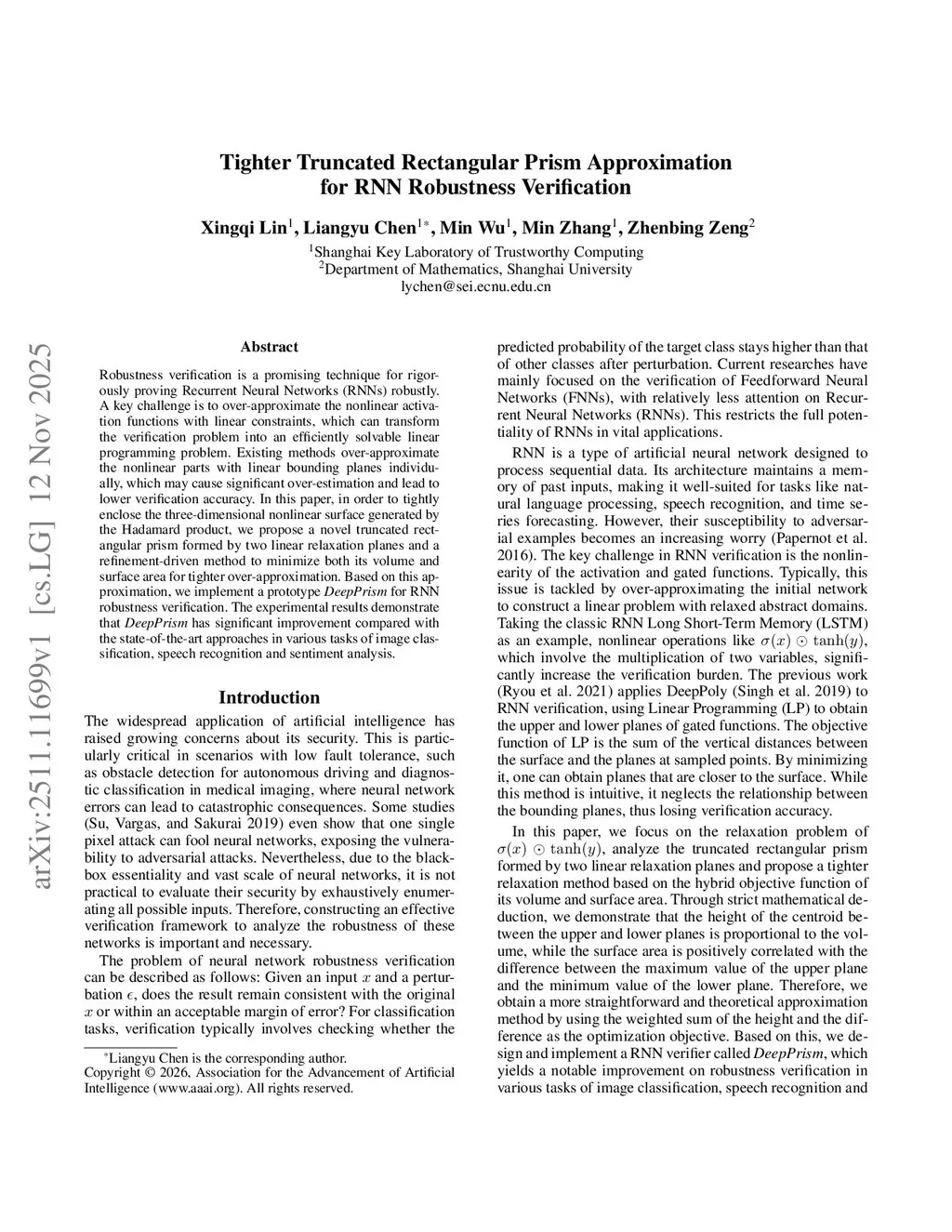 Robustness verification is a promising technique for rigorously proving Recurrent Neural Networks (RNNs) robustly. A key challenge is to over-approximate the nonlinear activation functions with linear constraints, which can transform the verification problem into an efficiently solvable linear programming problem. Existing methods over-approximate the nonlinear parts with linear bounding planes individually, which may cause significant over-estimation and lead to lower verification accuracy. In this paper, in order to tightly enclose the three-dimensional nonlinear surface generated by the Hadamard product, we propose a novel truncated rectangular prism formed by two linear relaxation planes and a refinement-driven method to minimize both its volume and surface area for tighter over-approximation. Based on this approximation, we implement a prototype DeepPrism for RNN robustness verification. The experimental results demonstrate that \emph{DeepPrism} has significant improvement compared with the state-of-the-art approaches in various tasks of image classification, speech recognition and sentiment analysis.