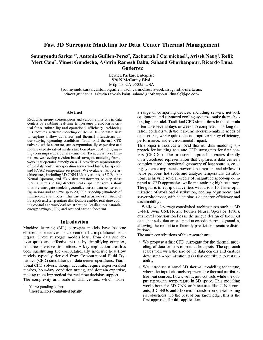 Reducing energy consumption and carbon emissions in data centers by enabling real-time temperature prediction is critical for sustainability and operational efficiency. Achieving this requires accurate modeling of the 3D temperature field to capture airflow dynamics and thermal interactions under varying operating conditions. Traditional thermal CFD solvers, while accurate, are computationally expensive and require expert-crafted meshes and boundary conditions, making them impractical for real-time use. To address these limitations, we develop a vision-based surrogate modeling framework that operates directly on a 3D voxelized representation of the data center, incorporating server workloads, fan speeds, and HVAC temperature set points. We evaluate multiple architectures, including 3D CNN U-Net variants, a 3D Fourier Neural Operator, and 3D vision transformers, to map these thermal inputs to high-fidelity heat maps. Our results show that the surrogate models generalize across data center configurations and significantly speed up computations (20,000x), from hundreds of milliseconds to hours. This fast and accurate estimation of hot spots and temperature distribution enables real-time cooling control and workload redistribution, leading to substantial energy savings (7\%) and reduced carbon footprint.