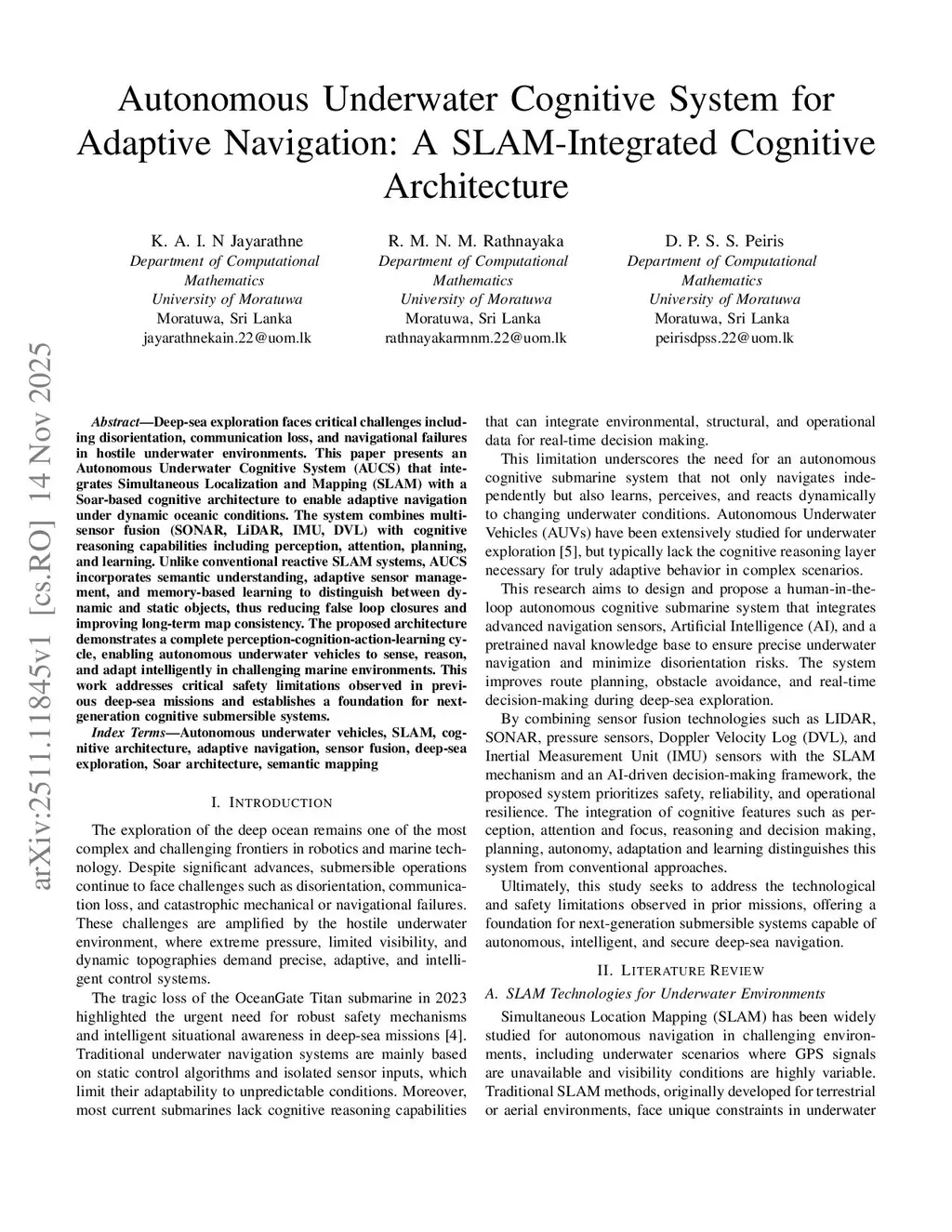 Deep-sea exploration poses significant challenges, including disorientation, communication loss, and navigational failures in dynamic underwater environments. This paper presents an Autonomous Underwater Cognitive System (AUCS) that integrates Simultaneous Localization and Mapping (SLAM) with a Soar-based cognitive architecture to enable adaptive navigation in complex oceanic conditions. The system fuses multi-sensor data from SONAR, LiDAR, IMU, and DVL with cognitive reasoning modules for perception, attention, planning, and learning. Unlike conventional SLAM systems, AUCS incorporates semantic understanding, adaptive sensor management, and memory-based learning to differentiate between dynamic and static objects, reducing false loop closures and enhancing long-term map consistency. The proposed architecture demonstrates a complete perception-cognition-action-learning loop, allowing autonomous underwater vehicles to sense, reason, and adapt intelligently. This work lays a foundation for next-generation cognitive submersible systems, improving safety, reliability, and autonomy in deep-sea exploration.