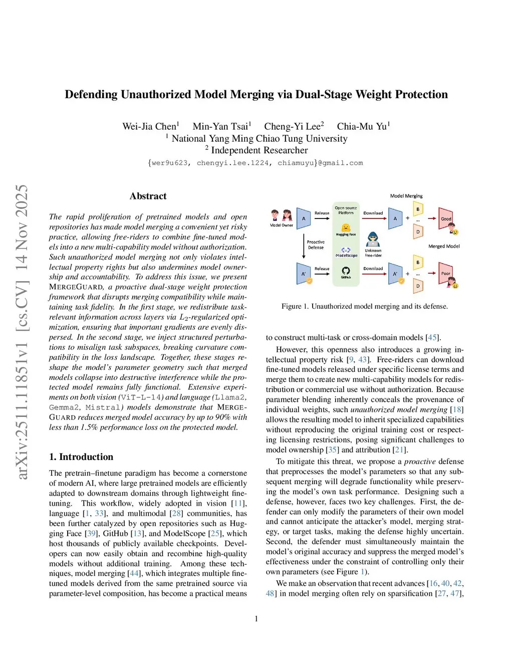 The rapid proliferation of pretrained models and open repositories has made model merging a convenient yet risky practice, allowing free-riders to combine fine-tuned models into a new multi-capability model without authorization. Such unauthorized model merging not only violates intellectual property rights but also undermines model ownership and accountability. To address this issue, we present MergeGuard, a proactive dual-stage weight protection framework that disrupts merging compatibility while maintaining task fidelity. In the first stage, we redistribute task-relevant information across layers via L2-regularized optimization, ensuring that important gradients are evenly dispersed. In the second stage, we inject structured perturbations to misalign task subspaces, breaking curvature compatibility in the loss landscape. Together, these stages reshape the model's parameter geometry such that merged models collapse into destructive interference while the protected model remains fully functional. Extensive experiments on both vision (ViT-L-14) and language (Llama2, Gemma2, Mistral) models demonstrate that MergeGuard reduces merged model accuracy by up to 90% with less than 1.5% performance loss on the protected model.
