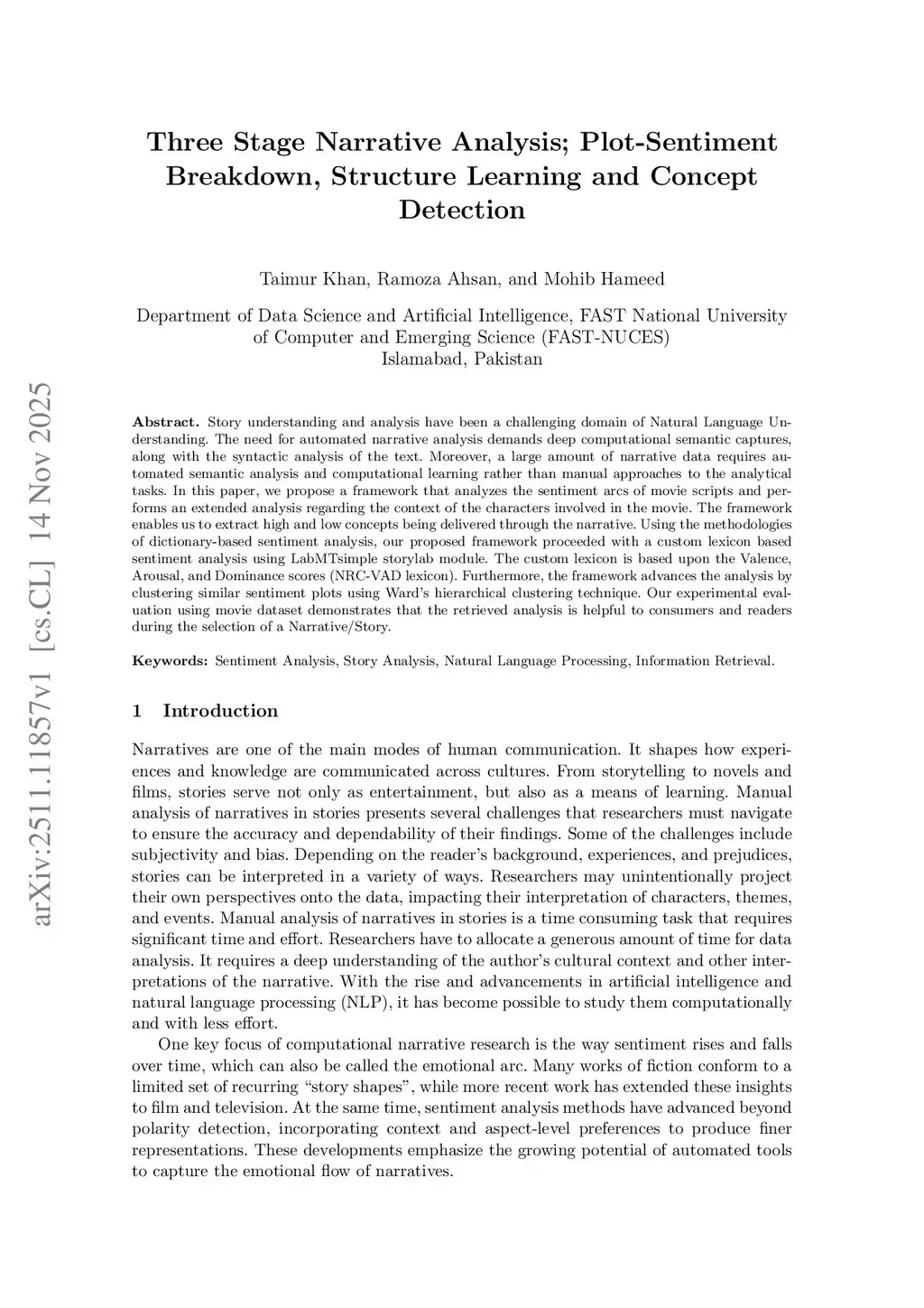 Three Stage Narrative Analysis; Plot-Sentiment Breakdown, Structure Learning and Concept Detection