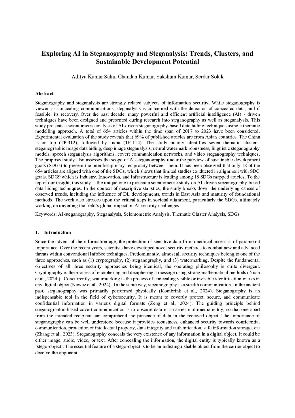 Exploring AI in Steganography and Steganalysis: Trends, Clusters, and Sustainable Development Potential