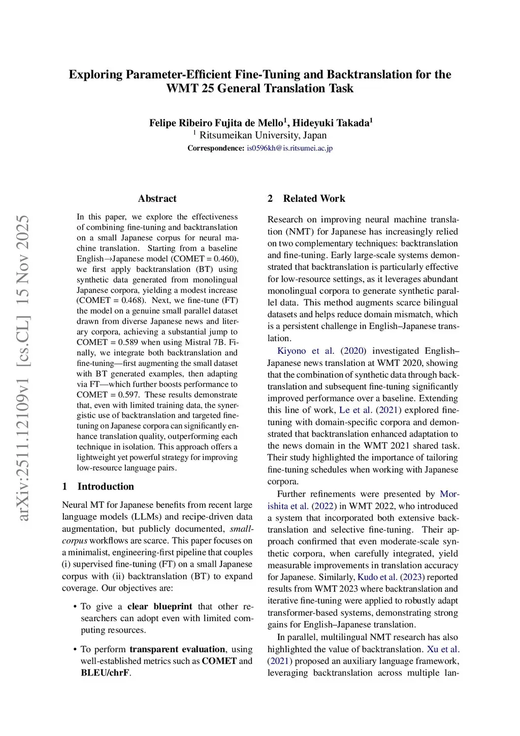 In this paper, we explore the effectiveness of combining fine-tuning and backtranslation on a small Japanese corpus for neural machine translation. Starting from a baseline English{\textrightarrow}Japanese model (COMET = 0.460), we first apply backtranslation (BT) using synthetic data generated from monolingual Japanese corpora, yielding a modest increase (COMET = 0.468). Next, we fine-tune (FT) the model on a genuine small parallel dataset drawn from diverse Japanese news and literary corpora, achieving a substantial jump to COMET = 0.589 when using Mistral 7B. Finally, we integrate both backtranslation and fine-tuning{ -- }first augmenting the small dataset with BT generated examples, then adapting via FT{ -- }which further boosts performance to COMET = 0.597. These results demonstrate that, even with limited training data, the synergistic use of backtranslation and targeted fine-tuning on Japanese corpora can significantly enhance translation quality, outperforming each technique in isolation. This approach offers a lightweight yet powerful strategy for improving low-resource language pairs.