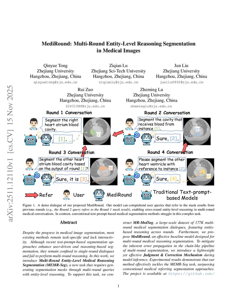 Despite the progress in medical image segmentation, most existing methods remain task-specific and lack interactivity. Although recent text-prompt-based segmentation approaches enhance user-driven and reasoning-based segmentation, they remain confined to single-round dialogues and fail to perform multi-round reasoning. In this work, we introduce Multi-Round Entity-Level Medical Reasoning Segmentation (MEMR-Seg), a new task that requires generating segmentation masks through multi-round queries with entity-level reasoning. To support this task, we construct MR-MedSeg, a large-scale dataset of 177K multi-round medical segmentation dialogues, featuring entity-based reasoning across rounds. Furthermore, we propose MediRound, an effective baseline model designed for multi-round medical reasoning segmentation. To mitigate the inherent error propagation in the chain-like pipeline of multi-round segmentation, we introduce a lightweight yet effective Judgment & Correction Mechanism during model inference. Experimental results demonstrate that our method effectively addresses the MEMR-Seg task and outperforms conventional medical referring segmentation methods.