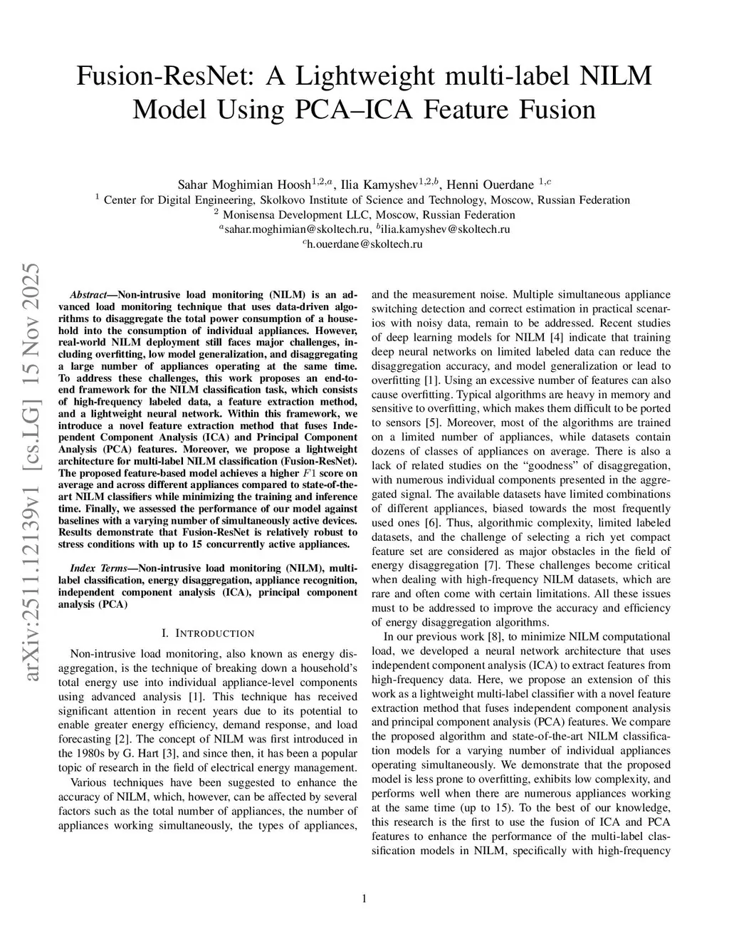 Fusion-ResNet: A Lightweight multi-label NILM Model Using PCA-ICA Feature Fusion