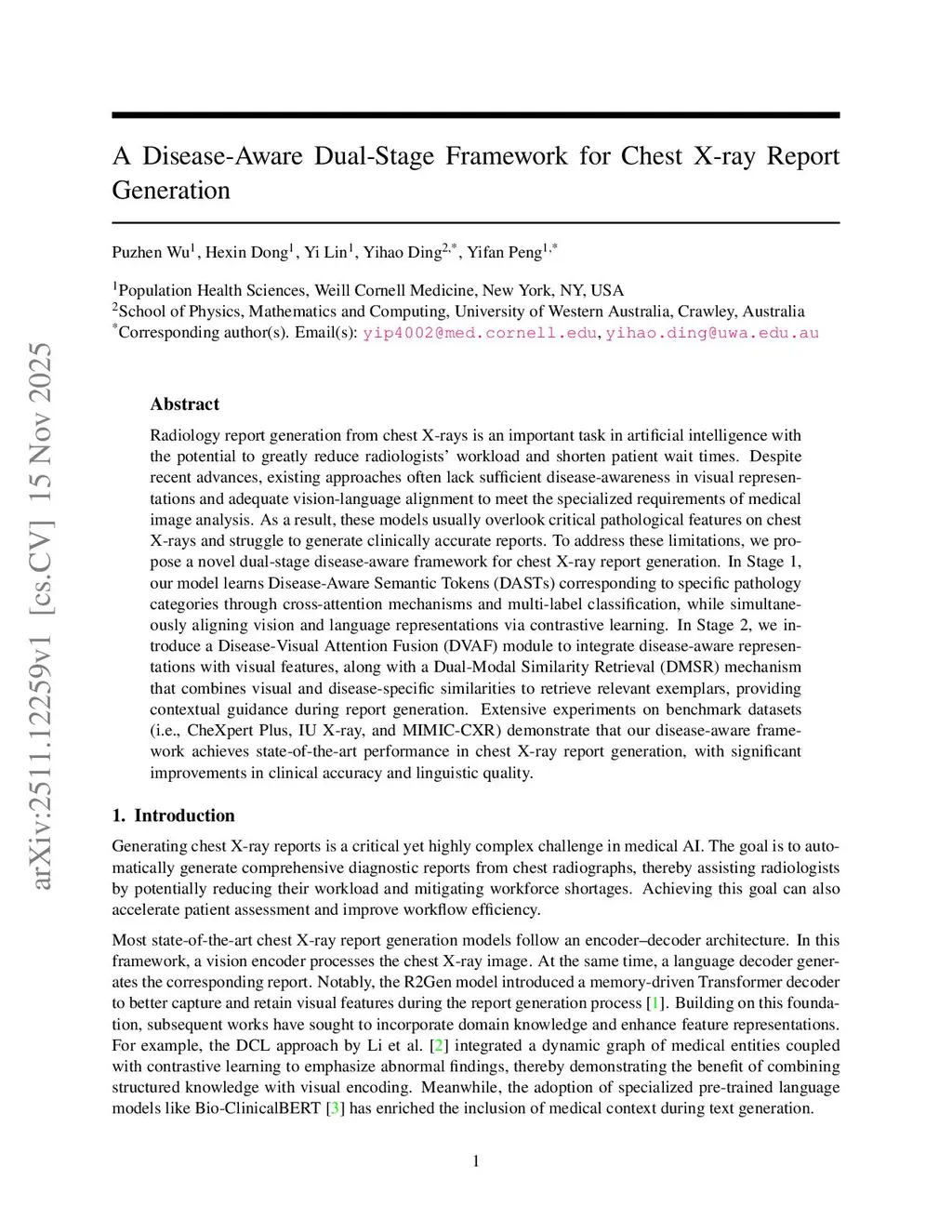 A Disease-Aware Dual-Stage Framework for Chest X-ray Report Generation