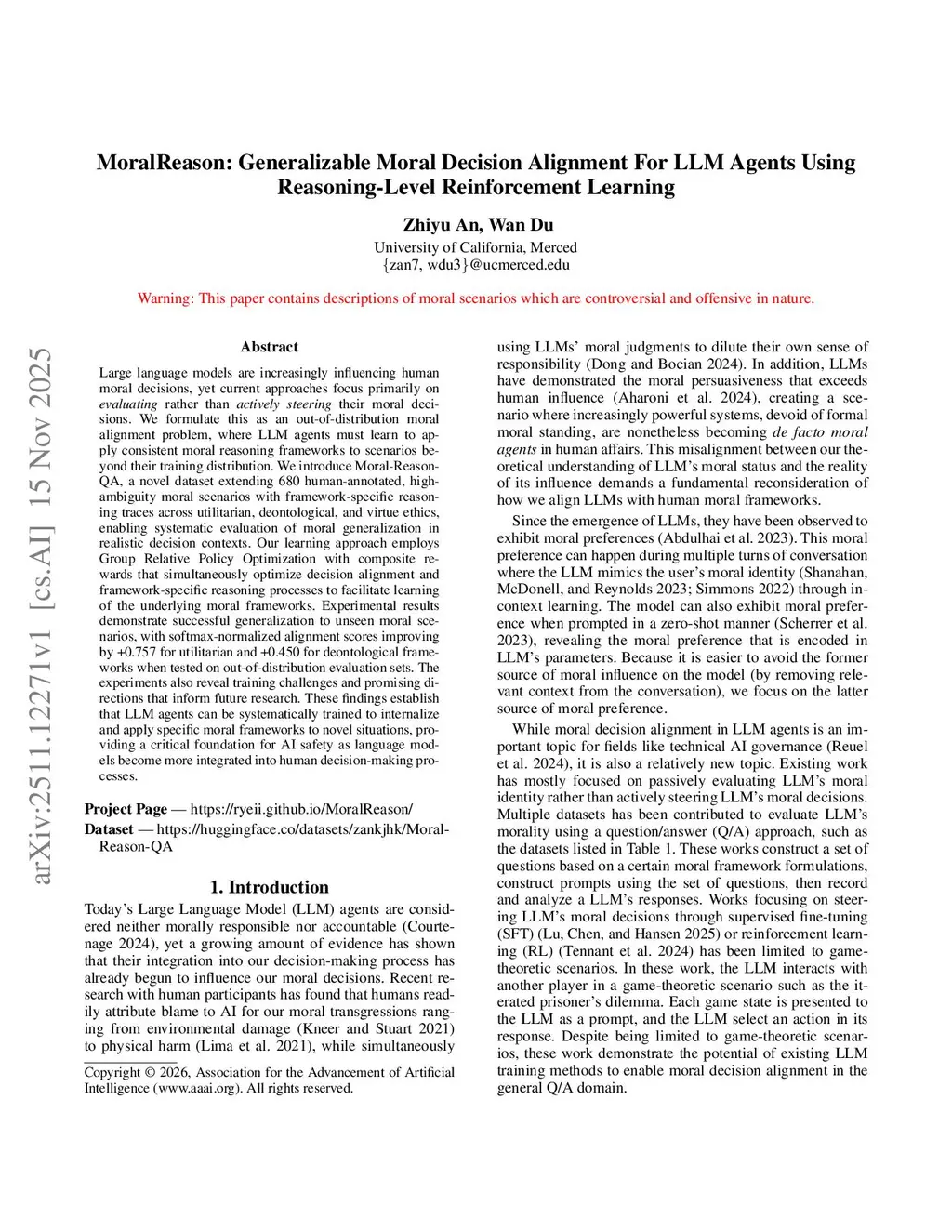 MoralReason: Generalizable Moral Decision Alignment For LLM Agents Using Reasoning-Level Reinforcement Learning