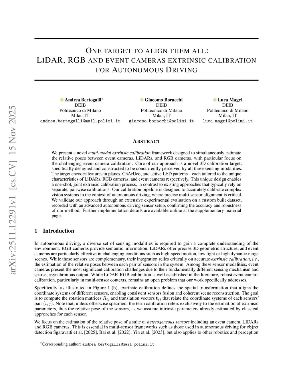 One target to align them all: LiDAR, RGB and event cameras extrinsic calibration for Autonomous Driving