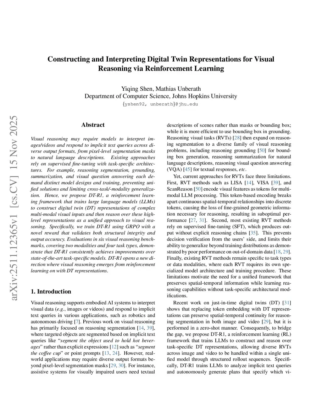 Visual reasoning may require models to interpret images and videos and respond to implicit text queries across diverse output formats, from pixel-level segmentation masks to natural language descriptions. Existing approaches rely on supervised fine-tuning with task-specific architectures. For example, reasoning segmentation, grounding, summarization, and visual question answering each demand distinct model designs and training, preventing unified solutions and limiting cross-task and cross-modality generalization. Hence, we propose DT-R1, a reinforcement learning framework that trains large language models to construct digital twin representations of complex multi-modal visual inputs and then reason over these high-level representations as a unified approach to visual reasoning. Specifically, we train DT-R1 using GRPO with a novel reward that validates both structural integrity and output accuracy. Evaluations in six visual reasoning benchmarks, covering two modalities and four task types, demonstrate that DT-R1 consistently achieves improvements over state-of-the-art task-specific models. DT-R1 opens a new direction where visual reasoning emerges from reinforcement learning with digital twin representations.
