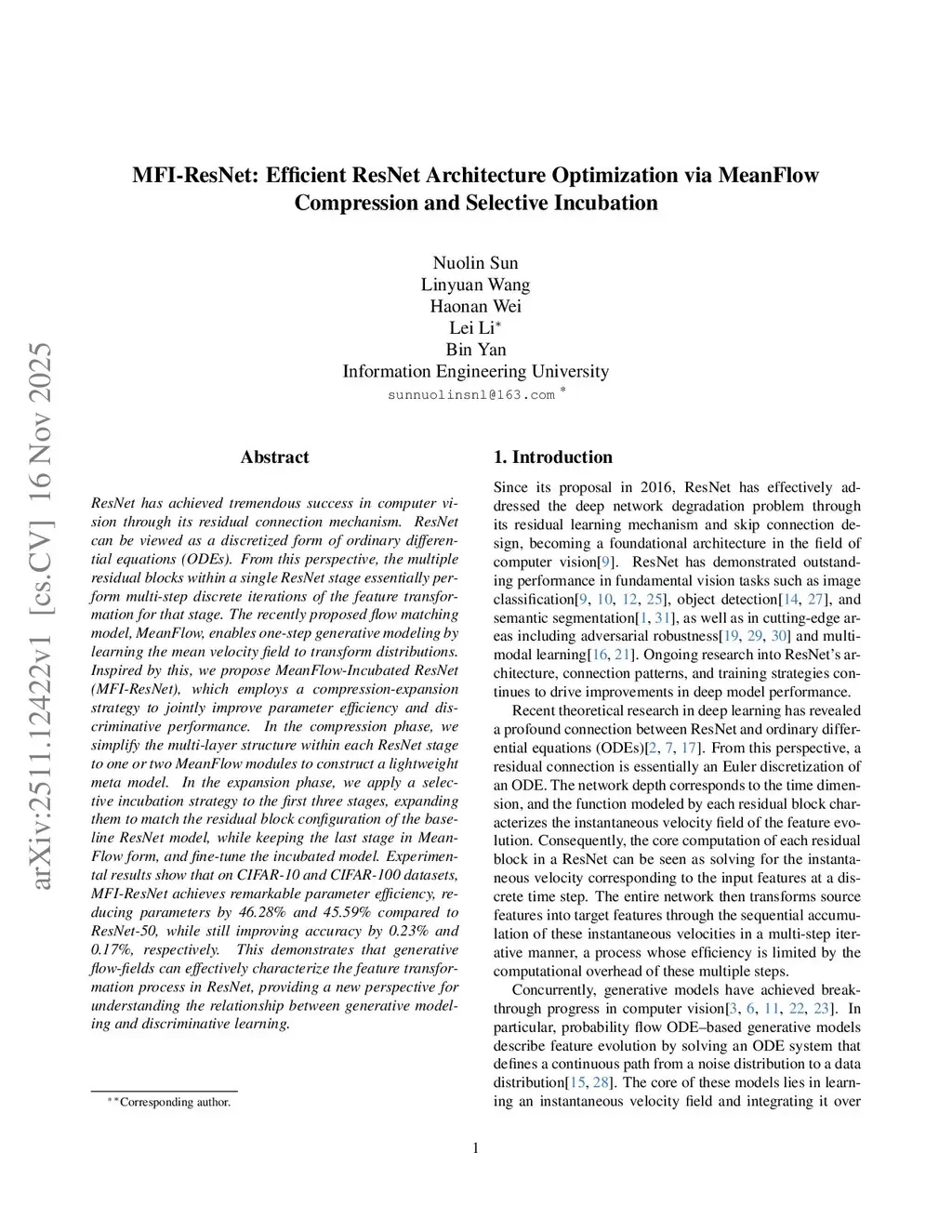 MFI-ResNet: Efficient ResNet Architecture Optimization via MeanFlow Compression and Selective Incubation