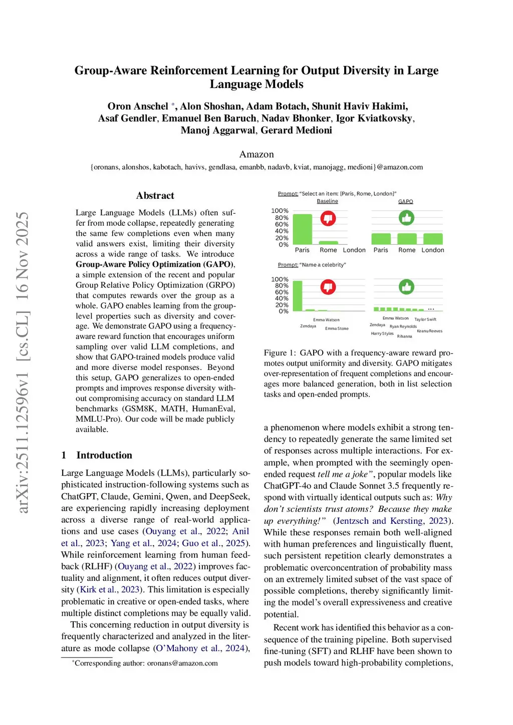 Large Language Models (LLMs) often suffer from mode collapse, repeatedly generating the same few completions even when many valid answers exist, limiting their diversity across a wide range of tasks. We introduce Group-Aware Policy Optimization (GAPO), a simple extension of the recent and popular Group Relative Policy Optimization (GRPO) that computes rewards over the group as a whole. GAPO enables learning from the group-level properties such as diversity and coverage. We demonstrate GAPO using a frequency-aware reward function that encourages uniform sampling over valid LLM completions, and show that GAPO-trained models produce valid and more diverse model responses. Beyond this setup, GAPO generalizes to open-ended prompts and improves response diversity without compromising accuracy on standard LLM benchmarks (GSM8K, MATH, HumanEval, MMLU-Pro). Our code will be made publicly available.