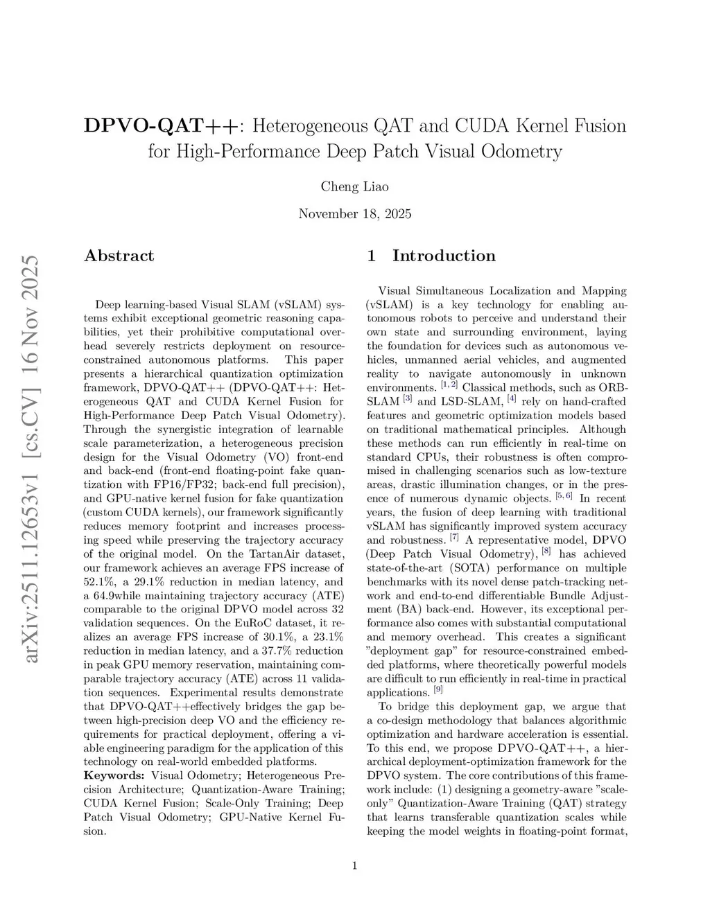 Deep learning-based Visual SLAM (vSLAM) systems exhibit exceptional geometric reasoning capabilities, yet their prohibitive computational overhead severely restricts deployment on resource-constrained autonomous platforms. This paper presents a hierarchical quantization optimization framework, DPVO-QAT++ (DPVO-QAT++: Heterogeneous QAT and CUDA Kernel Fusion for High-Performance Deep Patch Visual Odometry). Through the synergistic integration of learnable scale parameterization, a heterogeneous precision design for the Visual Odometry (VO) front-end and back-end (front-end floating-point fake quantization with FP16/FP32; back-end full precision), and GPU-native kernel fusion for fake quantization (custom CUDA kernels), our framework significantly reduces memory footprint and increases processing speed while preserving the trajectory accuracy of the original model. On the TartanAir dataset, our framework achieves an average FPS increase of 52.1%, a 29.1% reduction in median latency, and a 64.9% reduction in peak GPU memory reservation, while maintaining trajectory accuracy (ATE) comparable to the original DPVO model across 32 validation sequences. On the EuRoC dataset, it realizes an average FPS increase of 30.1%, a 23.1% reduction in median latency, and a 37.7% reduction in peak GPU memory reservation, maintaining comparable trajectory accuracy (ATE) across 11 validation sequences. Experimental results demonstrate that DPVO-QAT++ effectively bridges the gap between high-precision deep VO and the efficiency requirements for practical deployment, offering a viable engineering paradigm for the application of this technology on real-world embedded platforms.Keywords: Visual Odometry, Heterogeneous Precision Architecture, Quantization-Aware Training, CUDA Kernel Fusion, Scale-Only Training, Deep Patch Visual Odometry, GPU-Native Kernel Fusion.