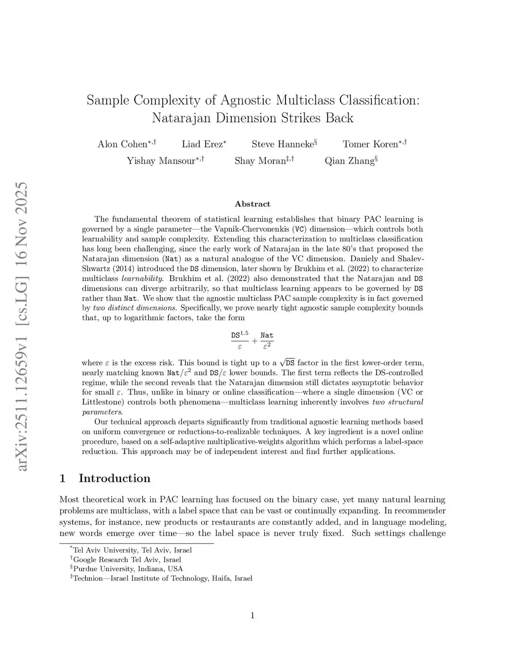 The fundamental theorem of statistical learning states that binary PAC learning is governed by a single parameter -- the Vapnik-Chervonenkis (VC) dimension -- which determines both learnability and sample complexity. Extending this to multiclass classification has long been challenging, since Natarajan's work in the late 80s proposing the Natarajan dimension (Nat) as a natural analogue of VC. Daniely and Shalev-Shwartz (2014) introduced the DS dimension, later shown by Brukhim et al. (2022) to characterize multiclass learnability. Brukhim et al. also showed that Nat and DS can diverge arbitrarily, suggesting that multiclass learning is governed by DS rather than Nat. We show that agnostic multiclass PAC sample complexity is in fact governed by two distinct dimensions. Specifically, we prove nearly tight agnostic sample complexity bounds that, up to log factors, take the form where is the excess risk. This bound is tight up to a factor in the first term, nearly matching known and lower bounds. The first term reflects the DS-controlled regime, while the second shows that the Natarajan dimension still dictates asymptotic behavior for small . Thus, unlike binary or online classification -- where a single dimension (VC or Littlestone) controls both phenomena -- multiclass learning inherently involves two structural parameters. Our technical approach departs from traditional agnostic learning methods based on uniform convergence or reductions to realizable cases. A key ingredient is a novel online procedure based on a self-adaptive multiplicative-weights algorithm performing a label-space reduction, which may be of independent interest.