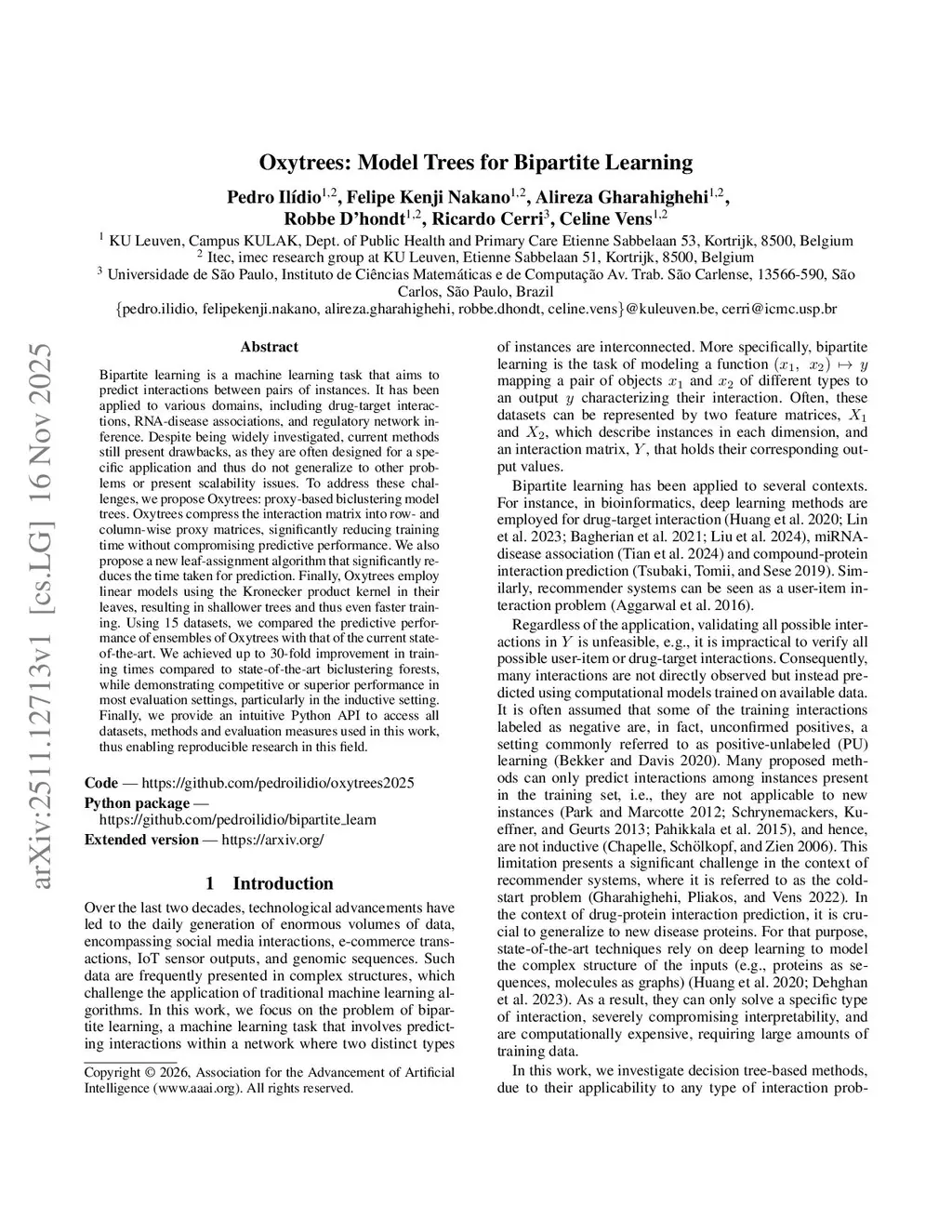 Bipartite learning is a machine learning task that aims to predict interactions between pairs of instances. It has been applied to various domains, including drug-target interactions, RNA-disease associations, and regulatory network inference. Despite being widely investigated, current methods still present drawbacks, as they are often designed for a specific application and thus do not generalize to other problems or present scalability issues. To address these challenges, we propose Oxytrees: proxy-based biclustering model trees. Oxytrees compress the interaction matrix into row- and column-wise proxy matrices, significantly reducing training time without compromising predictive performance. We also propose a new leaf-assignment algorithm that significantly reduces the time taken for prediction. Finally, Oxytrees employ linear models using the Kronecker product kernel in their leaves, resulting in shallower trees and thus even faster training. Using 15 datasets, we compared the predictive performance of ensembles of Oxytrees with that of the current state-of-the-art. We achieved up to 30-fold improvement in training times compared to state-of-the-art biclustering forests, while demonstrating competitive or superior performance in most evaluation settings, particularly in the inductive setting. Finally, we provide an intuitive Python API to access all datasets, methods and evaluation measures used in this work, thus enabling reproducible research in this field.