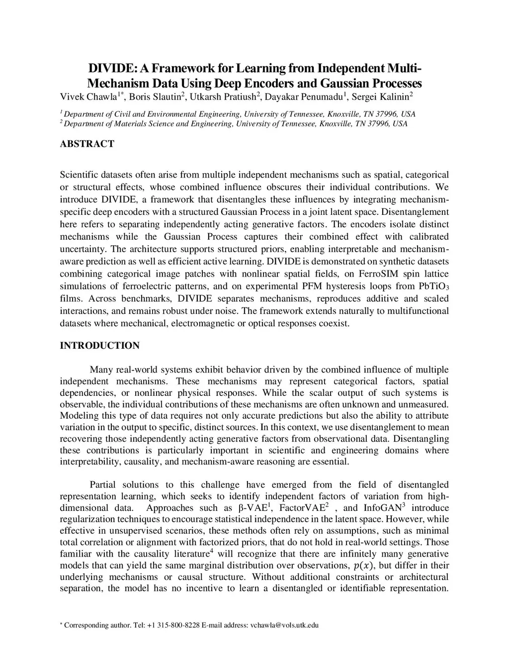 Scientific datasets often arise from multiple independent mechanisms such as spatial, categorical or structural effects, whose combined influence obscures their individual contributions. We introduce DIVIDE, a framework that disentangles these influences by integrating mechanism-specific deep encoders with a structured Gaussian Process in a joint latent space. Disentanglement here refers to separating independently acting generative factors. The encoders isolate distinct mechanisms while the Gaussian Process captures their combined effect with calibrated uncertainty. The architecture supports structured priors, enabling interpretable and mechanism-aware prediction as well as efficient active learning. DIVIDE is demonstrated on synthetic datasets combining categorical image patches with nonlinear spatial fields, on FerroSIM spin lattice simulations of ferroelectric patterns, and on experimental PFM hysteresis loops from PbTiO3 films. Across benchmarks, DIVIDE separates mechanisms, reproduces additive and scaled interactions, and remains robust under noise. The framework extends naturally to multifunctional datasets where mechanical, electromagnetic or optical responses coexist.