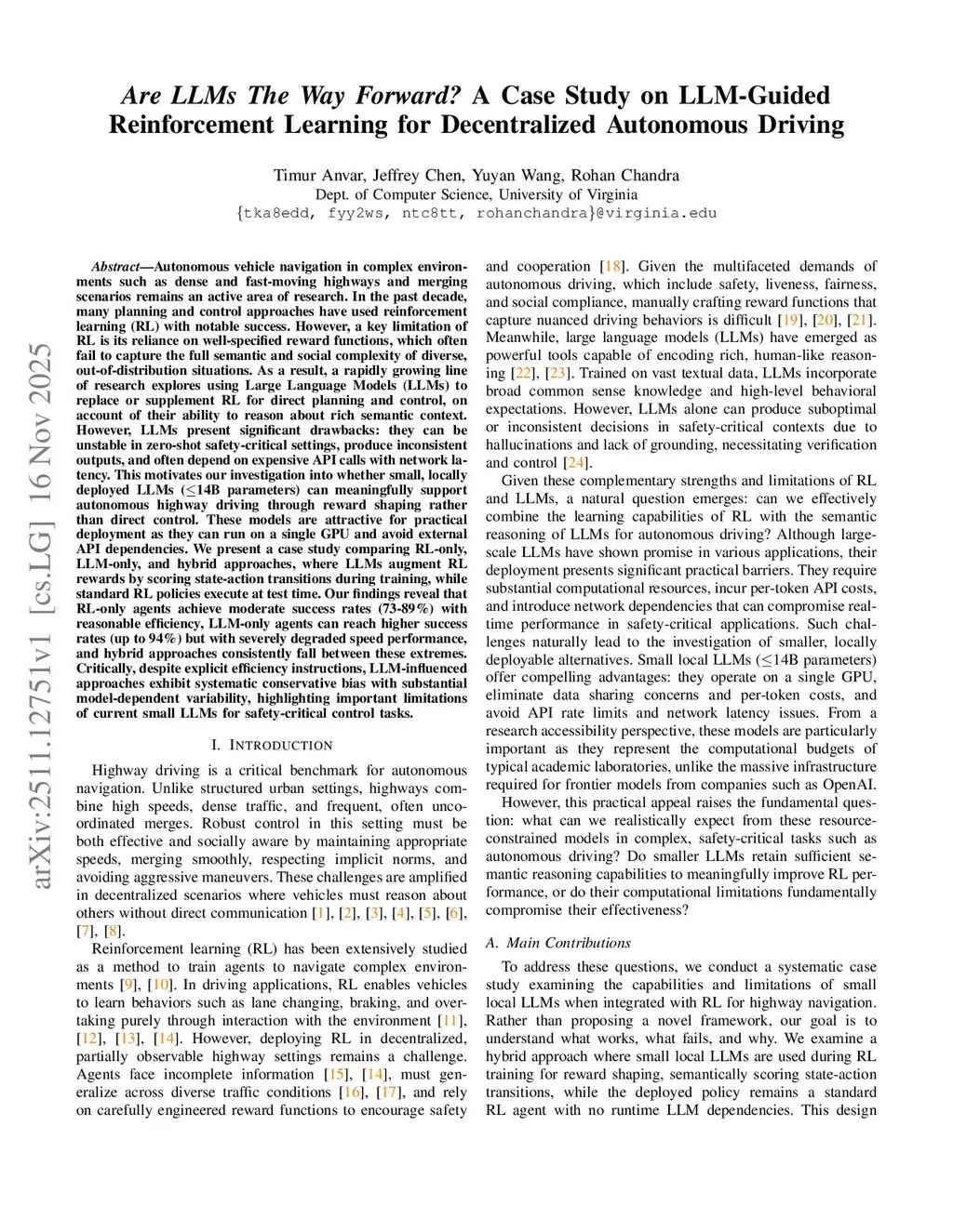Autonomous vehicle navigation in complex environments such as dense and fast-moving highways and merging scenarios remains an active area of research. A key limitation of RL is its reliance on well-specified reward functions, which often fail to capture the full semantic and social complexity of diverse, out-of-distribution situations. As a result, a rapidly growing line of research explores using Large Language Models (LLMs) to replace or supplement RL for direct planning and control, on account of their ability to reason about rich semantic context. However, LLMs present significant drawbacks: they can be unstable in zero-shot safety-critical settings, produce inconsistent outputs, and often depend on expensive API calls with network latency. This motivates our investigation into whether small, locally deployed LLMs (< 14B parameters) can meaningfully support autonomous highway driving through reward shaping rather than direct control. We present a case study comparing RL-only, LLM-only, and hybrid approaches, where LLMs augment RL rewards by scoring state-action transitions during training, while standard RL policies execute at test time. Our findings reveal that RL-only agents achieve moderate success rates (73-89%) with reasonable efficiency, LLM-only agents can reach higher success rates (up to 94%) but with severely degraded speed performance, and hybrid approaches consistently fall between these extremes. Critically, despite explicit efficiency instructions, LLM-influenced approaches exhibit systematic conservative bias with substantial model-dependent variability, highlighting important limitations of current small LLMs for safety-critical control tasks.
