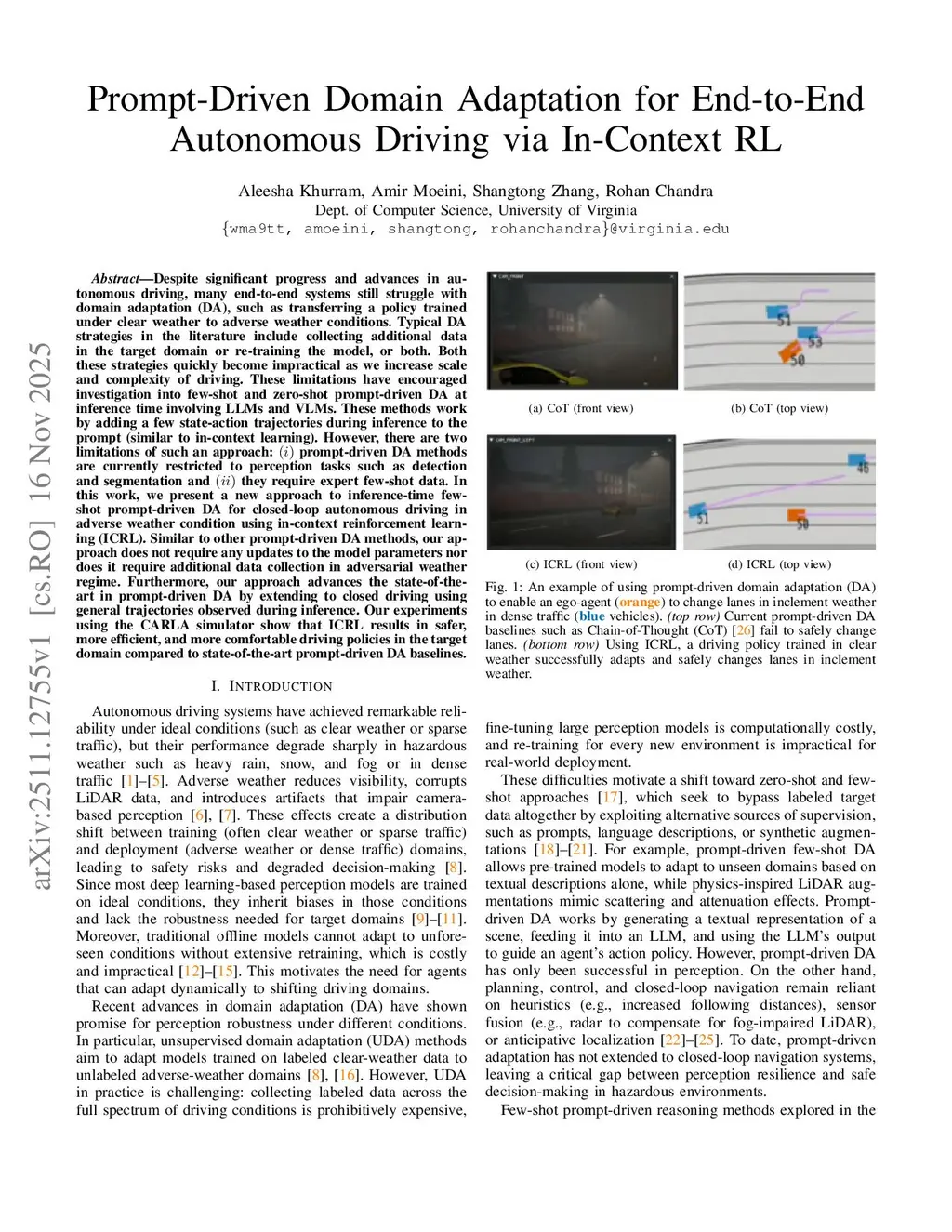 Despite significant progress and advances in autonomous driving, many end-to-end systems still struggle with domain adaptation (DA), such as transferring a policy trained under clear weather to adverse weather conditions. Typical DA strategies in the literature include collecting additional data in the target domain or re-training the model, or both. Both these strategies quickly become impractical as we increase scale and complexity of driving. These limitations have encouraged investigation into few-shot and zero-shot prompt-driven DA at inference time involving LLMs and VLMs. These methods work by adding a few state-action trajectories during inference to the prompt (similar to in-context learning). However, there are two limitations of such an approach: prompt-driven DA methods are currently restricted to perception tasks such as detection and segmentation and they require expert few-shot data. In this work, we present a new approach to inference-time few-shot prompt-driven DA for closed-loop autonomous driving in adverse weather condition using in-context reinforcement learning (ICRL). Similar to other prompt-driven DA methods, our approach does not require any updates to the model parameters nor does it require additional data collection in adversarial weather regime. Furthermore, our approach advances the state-of-the-art in prompt-driven DA by extending to closed driving using general trajectories observed during inference. Our experiments using the CARLA simulator show that ICRL results in safer, more efficient, and more comfortable driving policies in the target domain compared to state-of-the-art prompt-driven DA baselines.