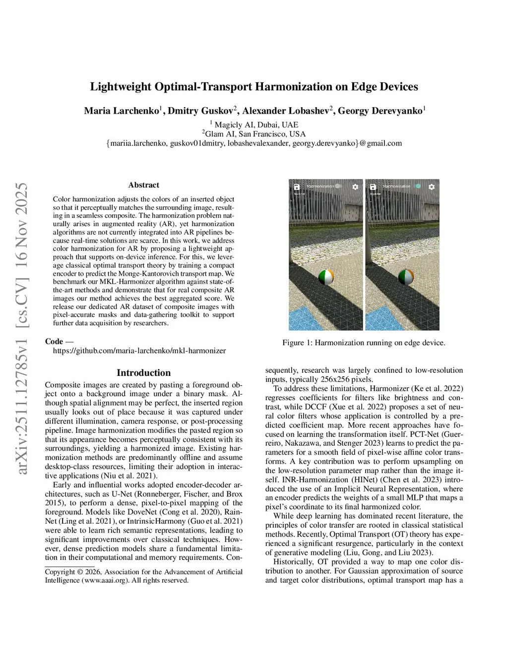Color harmonization adjusts the colors of an inserted object so that it perceptually matches the surrounding image, resulting in a seamless composite. The harmonization problem naturally arises in augmented reality (AR), yet harmonization algorithms are not currently integrated into AR pipelines because real-time solutions are scarce. In this work, we address color harmonization for AR by proposing a lightweight approach that supports on-device inference. For this, we leverage classical optimal transport theory by training a compact encoder to predict the Monge-Kantorovich transport map. We benchmark our MKL-Harmonizer algorithm against state-of-the-art methods and demonstrate that for real composite AR images our method achieves the best aggregated score. We release our dedicated AR dataset of composite images with pixel-accurate masks and data-gathering toolkit to support further data acquisition by researchers.