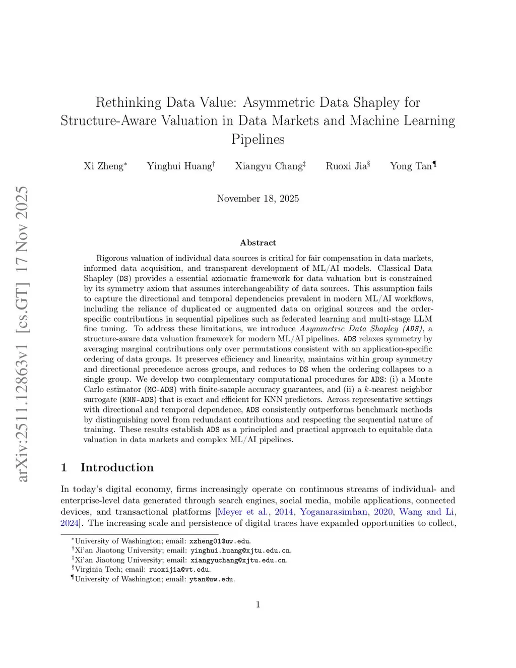 Rigorous valuation of individual data sources is critical for fair compensation in data markets, informed data acquisition, and transparent development of ML/AI models. Classical Data Shapley (DS) provides a essential axiomatic framework for data valuation but is constrained by its symmetry axiom that assumes interchangeability of data sources. This assumption fails to capture the directional and temporal dependencies prevalent in modern ML/AI workflows, including the reliance of duplicated or augmented data on original sources and the order-specific contributions in sequential pipelines such as federated learning and multi-stage LLM fine tuning. To address these limitations, we introduce Asymmetric Data Shapley (ADS), a structure-aware data valuation framework for modern ML/AI pipelines. ADS relaxes symmetry by averaging marginal contributions only over permutations consistent with an application-specific ordering of data groups. It preserves efficiency and linearity, maintains within group symmetry and directional precedence across groups, and reduces to DS when the ordering collapses to a single group. We develop two complementary computational procedures for ADS: (i) a Monte Carlo estimator (MC-ADS) with finite-sample accuracy guarantees, and (ii) a k-nearest neighbor surrogate (KNN-ADS) that is exact and efficient for KNN predictors. Across representative settings with directional and temporal dependence, ADS consistently outperforms benchmark methods by distinguishing novel from redundant contributions and respecting the sequential nature of training. These results establish ADS as a principled and practical approach to equitable data valuation in data markets and complex ML/AI pipelines.