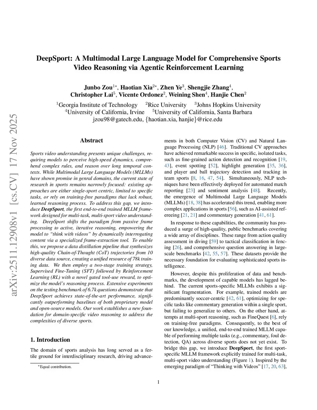 Sports video understanding presents unique challenges, requiring models to perceive high-speed dynamics, comprehend complex rules, and reason over long temporal contexts. While Multimodal Large Language Models (MLLMs) have shown promise in genral domains, the current state of research in sports remains narrowly focused: existing approaches are either single-sport centric, limited to specific tasks, or rely on training-free paradigms that lack robust, learned reasoning process. To address this gap, we introduce DeepSport, the first end-to-end trained MLLM framework designed for multi-task, multi-sport video understanding. DeepSport shifts the paradigm from passive frame processing to active, iterative reasoning, empowering the model to ``think with videos'' by dynamically interrogating content via a specialized frame-extraction tool. To enable this, we propose a data distillation pipeline that synthesizes high-quality Chain-of-Thought (CoT) trajectories from 10 diverse data source, creating a unified resource of 78k training data. We then employ a two-stage training strategy, Supervised Fine-Tuning (SFT) followed by Reinforcement Learning (RL) with a novel gated tool-use reward, to optimize the model's reasoning process. Extensive experiments on the testing benchmark of 6.7k questions demonstrate that DeepSport achieves state-of-the-art performance, significantly outperforming baselines of both proprietary model and open-source models. Our work establishes a new foundation for domain-specific video reasoning to address the complexities of diverse sports.