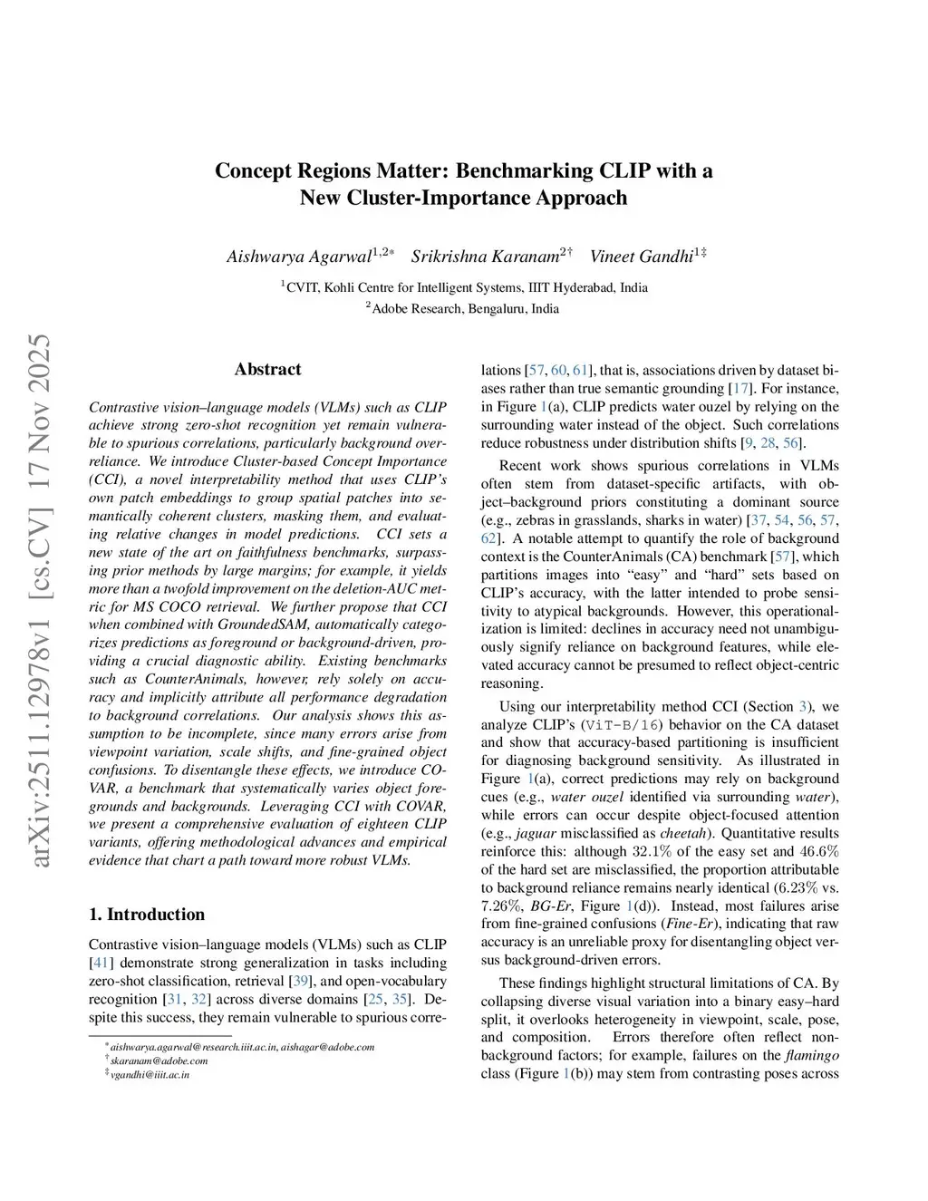 Contrastive vision-language models (VLMs) such as CLIP achieve strong zero-shot recognition yet remain vulnerable to spurious correlations, particularly background over-reliance. We introduce Cluster-based Concept Importance (CCI), a novel interpretability method that uses CLIP's own patch embeddings to group spatial patches into semantically coherent clusters, mask them, and evaluate relative changes in model predictions. CCI sets a new state of the art on faithfulness benchmarks, surpassing prior methods by large margins; for example, it yields more than a twofold improvement on the deletion-AUC metric for MS COCO retrieval. We further propose that CCI, when combined with GroundedSAM, automatically categorizes predictions as foreground- or background-driven, providing a crucial diagnostic ability. Existing benchmarks such as CounterAnimals, however, rely solely on accuracy and implicitly attribute all performance degradation to background correlations. Our analysis shows this assumption to be incomplete, since many errors arise from viewpoint variation, scale shifts, and fine-grained object confusions. To disentangle these effects, we introduce COVAR, a benchmark that systematically varies object foregrounds and backgrounds. Leveraging CCI with COVAR, we present a comprehensive evaluation of eighteen CLIP variants, offering methodological advances and empirical evidence that chart a path toward more robust VLMs.