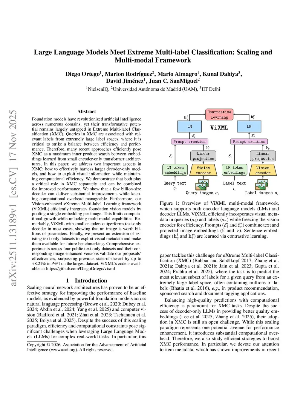 Foundation models have revolutionized artificial intelligence across numerous domains, yet their transformative potential remains largely untapped in Extreme Multi-label Classification (XMC). Queries in XMC are associated with relevant labels from extremely large label spaces, where it is critical to strike a balance between efficiency and performance. Therefore, many recent approaches efficiently pose XMC as a maximum inner product search between embeddings learned from small encoder-only transformer architectures. In this paper, we address two important aspects in XMC: how to effectively harness larger decoder-only models, and how to exploit visual information while maintaining computational efficiency. We demonstrate that both play a critical role in XMC separately and can be combined for improved performance. We show that a few billion-size decoder can deliver substantial improvements while keeping computational overhead manageable. Furthermore, our Vision-enhanced eXtreme Multi-label Learning framework (ViXML) efficiently integrates foundation vision models by pooling a single embedding per image. This limits computational growth while unlocking multi-modal capabilities. Remarkably, ViXML with small encoders outperforms text-only decoder in most cases, showing that an image is worth billions of parameters. Finally, we present an extension of existing text-only datasets to exploit visual metadata and make them available for future benchmarking. Comprehensive experiments across four public text-only datasets and their corresponding image enhanced versions validate our proposals' effectiveness, surpassing previous state-of-the-art by up to +8.21\% in P@1 on the largest dataset. ViXML's code is available atthis https URL.