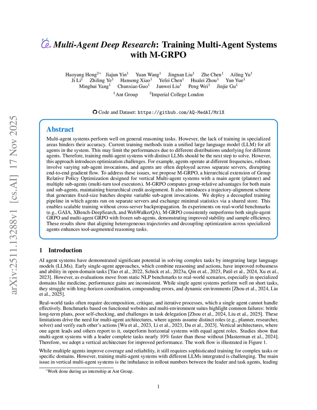 Multi-agent systems perform well on general reasoning tasks. However, the lack of training in specialized areas hinders their accuracy. Current training methods train a unified large language model (LLM) for all agents in the system. This may limit the performances due to different distributions underlying for different agents. Therefore, training multi-agent systems with distinct LLMs should be the next step to solve. However, this approach introduces optimization challenges. For example, agents operate at different frequencies, rollouts involve varying sub-agent invocations, and agents are often deployed across separate servers, disrupting end-to-end gradient flow. To address these issues, we propose M-GRPO, a hierarchical extension of Group Relative Policy Optimization designed for vertical Multi-agent systems with a main agent (planner) and multiple sub-agents (multi-turn tool executors). M-GRPO computes group-relative advantages for both main and sub-agents, maintaining hierarchical credit assignment. It also introduces a trajectory-alignment scheme that generates fixed-size batches despite variable sub-agent invocations. We deploy a decoupled training pipeline in which agents run on separate servers and exchange minimal statistics via a shared store. This enables scalable training without cross-server backpropagation. In experiments on real-world benchmarks (e.g., GAIA, XBench-DeepSearch, and WebWalkerQA), M-GRPO consistently outperforms both single-agent GRPO and multi-agent GRPO with frozen sub-agents, demonstrating improved stability and sample efficiency. These results show that aligning heterogeneous trajectories and decoupling optimization across specialized agents enhances tool-augmented reasoning tasks.